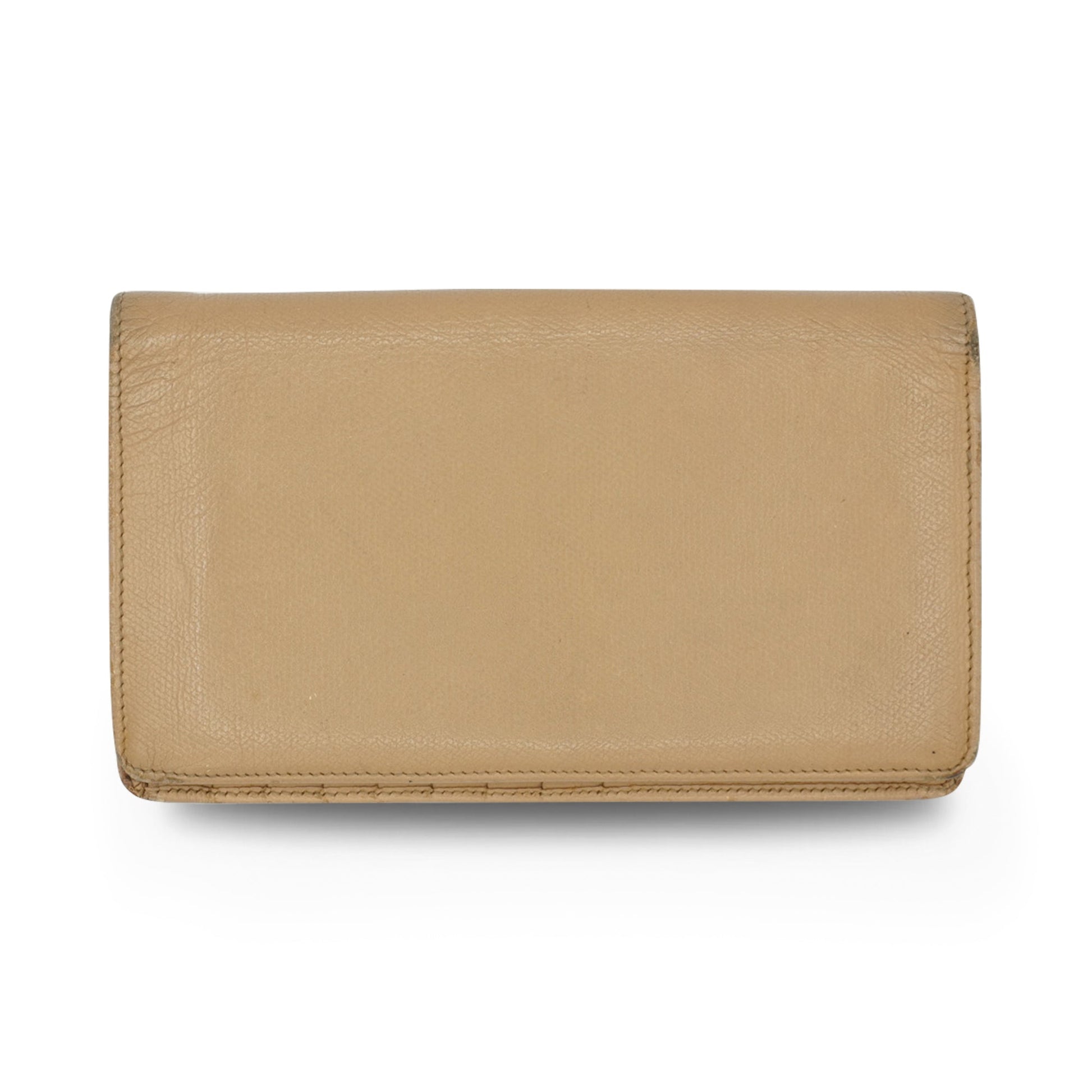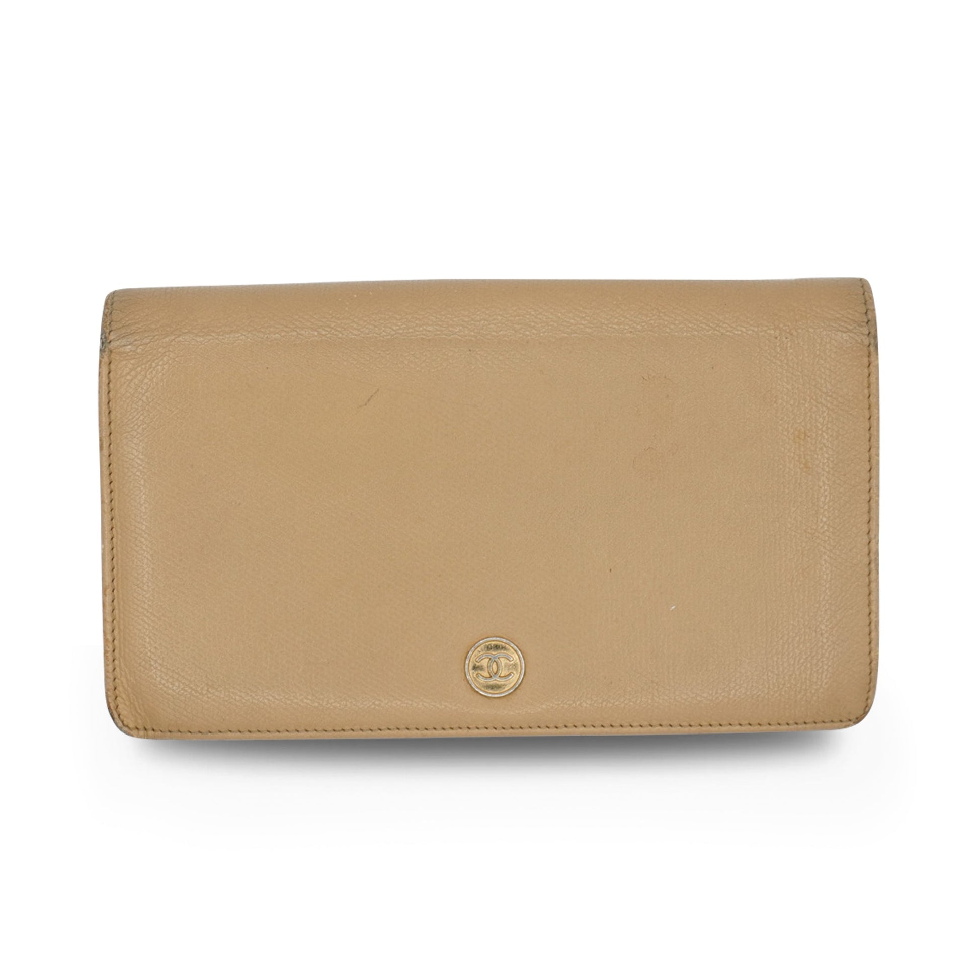 Chanel vintage wallet in tan leather with a gold 'CC' emblem on the front, a fold opening, and several interior card and cash pockets.