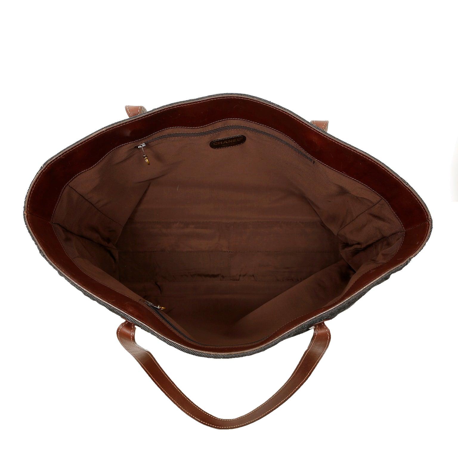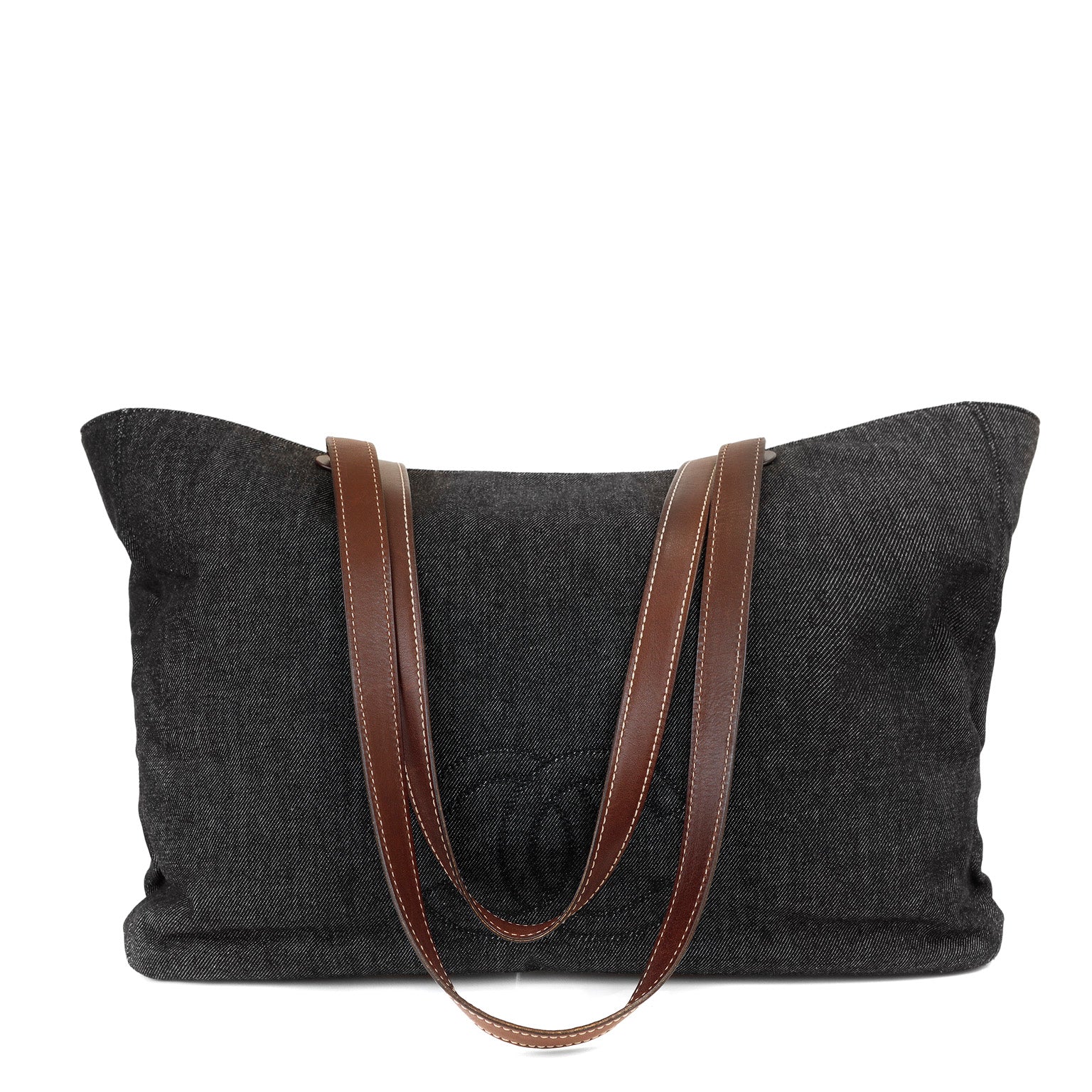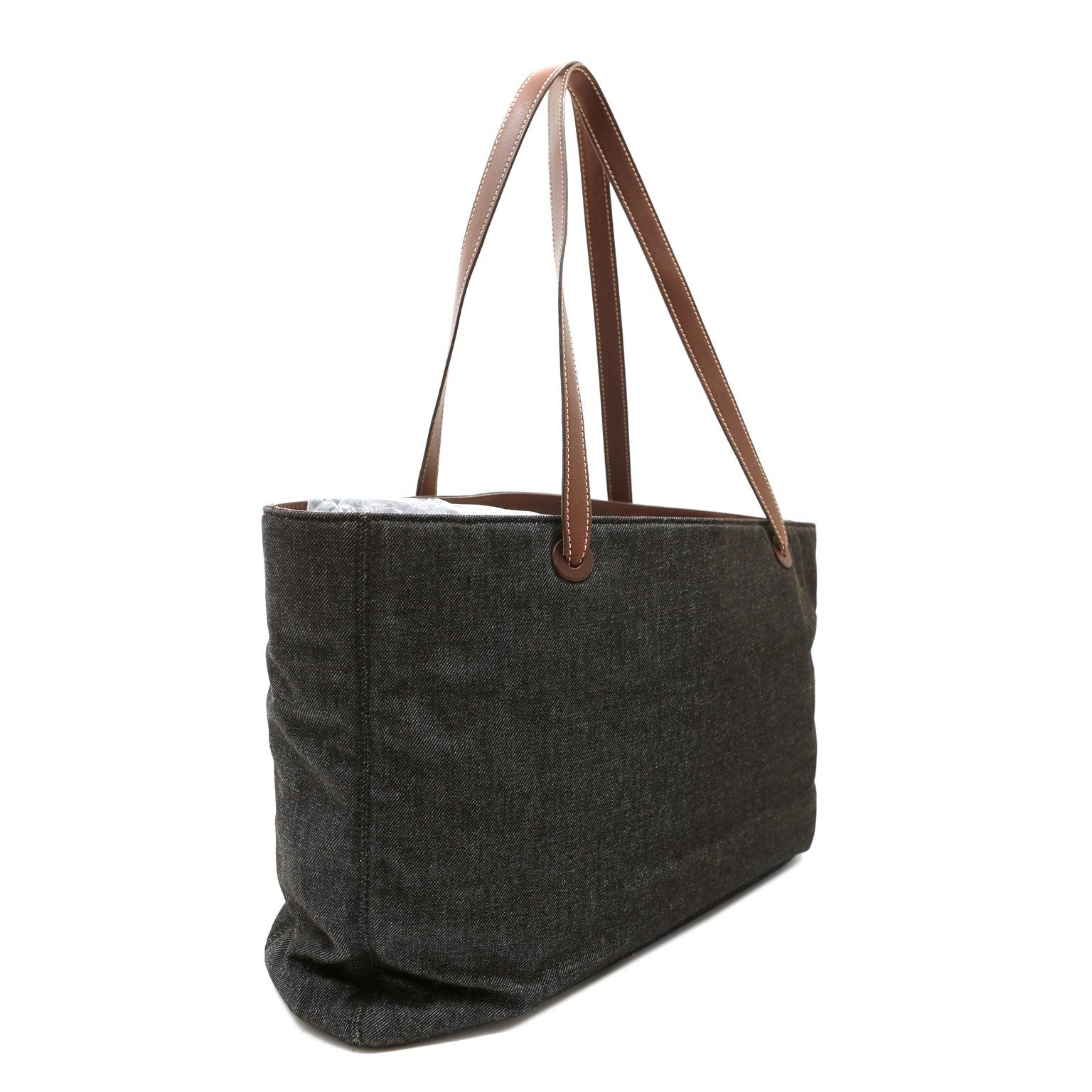 Black denim extra large tote Bag with contrasting brown leather double shoulder straps. Interlocking CC is tonally stitched on the front. Very spacious fabric interior has a zippered pocket on either wall. Made in Italy.