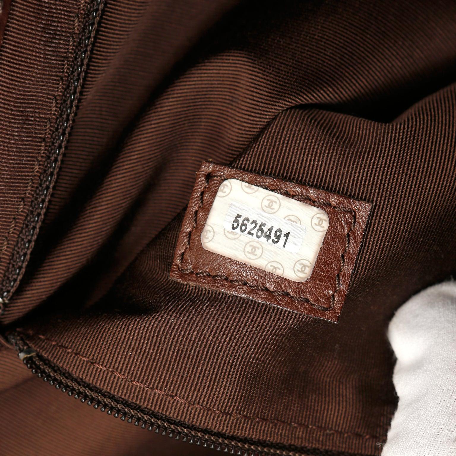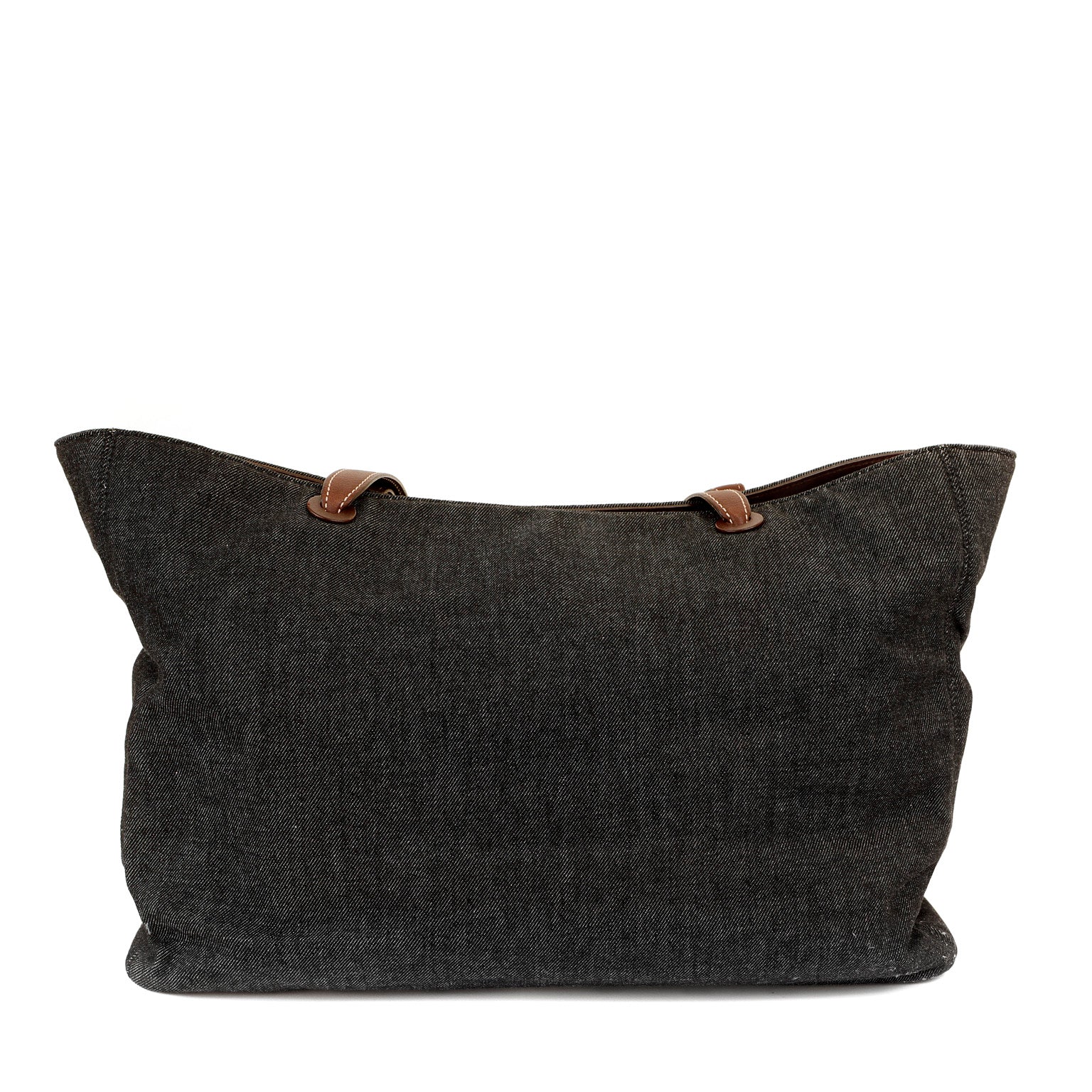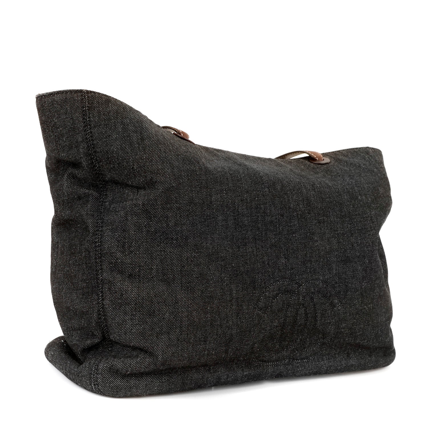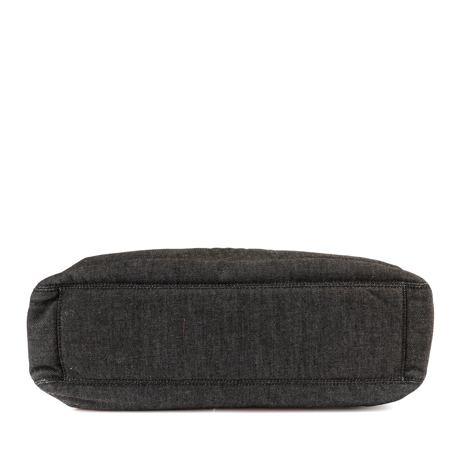 Black denim extra large tote Bag with contrasting brown leather double shoulder straps. Interlocking CC is tonally stitched on the front. Very spacious fabric interior has a zippered pocket on either wall. Made in Italy.