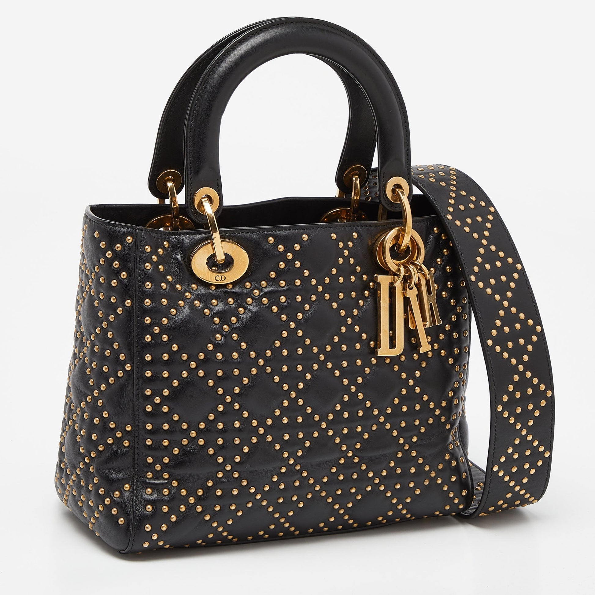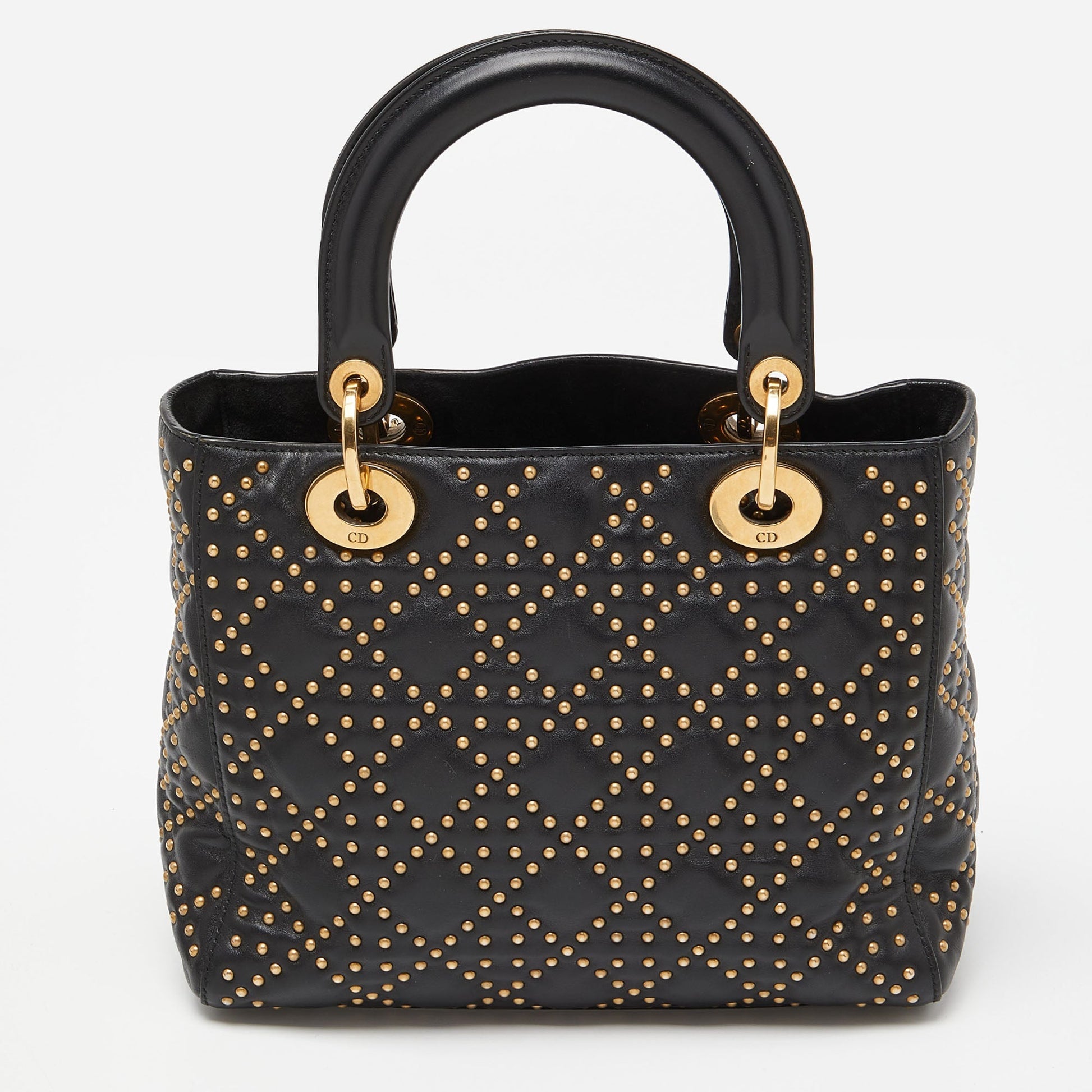 Due to detailed and innovative designs, Dior has managed to be at the top of fashions hierarchy through the years. Infuse the signature aesthetics of the brand into your outfit by accessorizing it with this Lady Dior tote. With a classic design, it is crafted from leather with a striking studs, and the brands letter charms mark its quality craftsmanship. The double handles at the top, a shoulder strap, and its perfectly sized interior make it a functional companion for your next soiree.