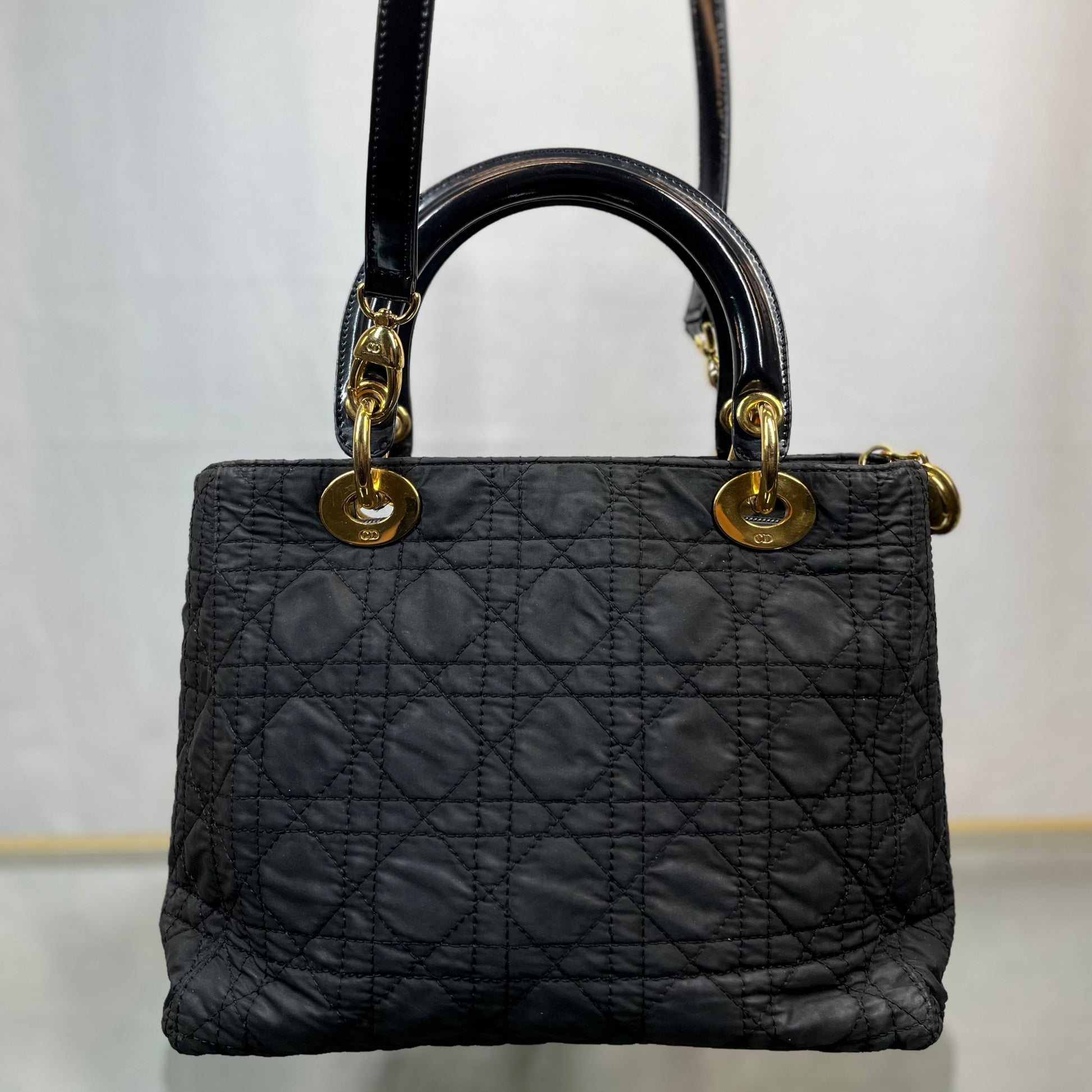 Indulge in luxury with the Dior Lady Dior Black Nylon Cannage Tote Bag. Crafted with precision, this elegant tote features the iconic Cannage pattern, making it a timeless statement piece. The spacious design and durable nylon construction offer both practicality and sophistication, making it perfect for any occasion. The bag is in good condition. The hardware shows moderate scratches but remains shiny and crisp. The nylon exterior is lightly and slightly tacky but could be cleaned if desired, though it's wearable as is. The corners show rubbing, and the bag's lining has lost some structure. The patent leather straps are slightly cloudy with scratches and scuffs. The interior has a scent associated with long-term storage and musk, along with a stain. Despite these minor imperfections, the bag remains a stunning addition to any collection.