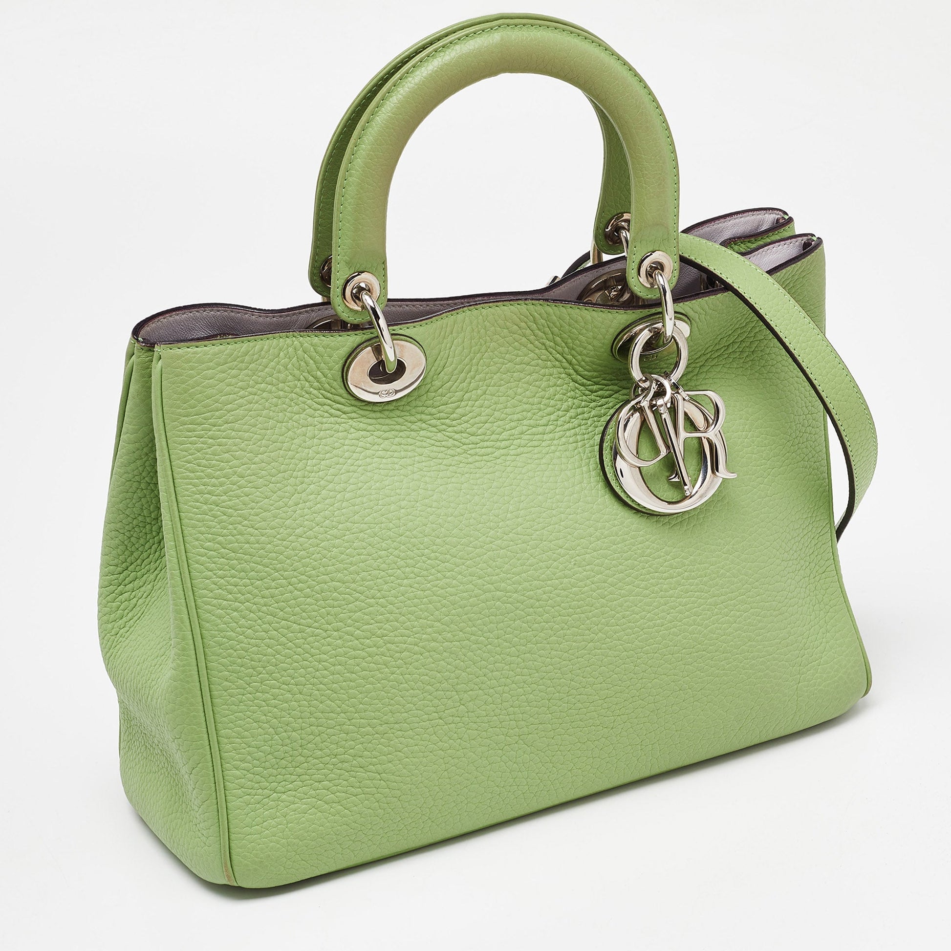 The Diorissimo shopper tote from Dior is a piece that has never gone out of style. The leather bag comes in a pleasing green shade with silver tone hardware and Dior letter charms. It features double top handles, a small pouch and protective feet at the bottom. A snap button closure opens to reveal a leather lined interior and enough space to easily hold your necessities. Flaunt this creation on your next shopping spree by owning it today