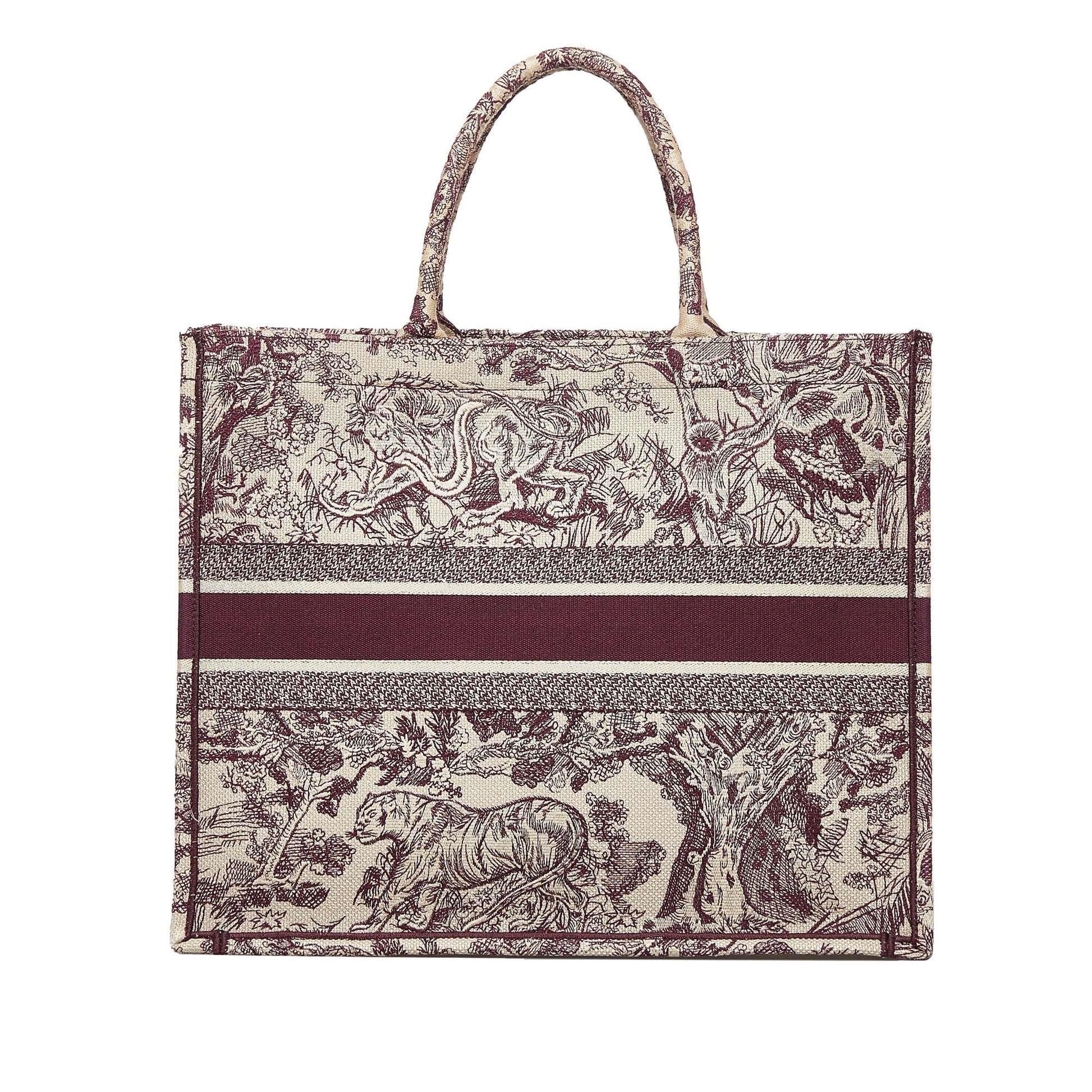 The Large Toile De Jouy Book Tote features a canvas body, rolled canvas handles, and an open top. Comes with dust bag