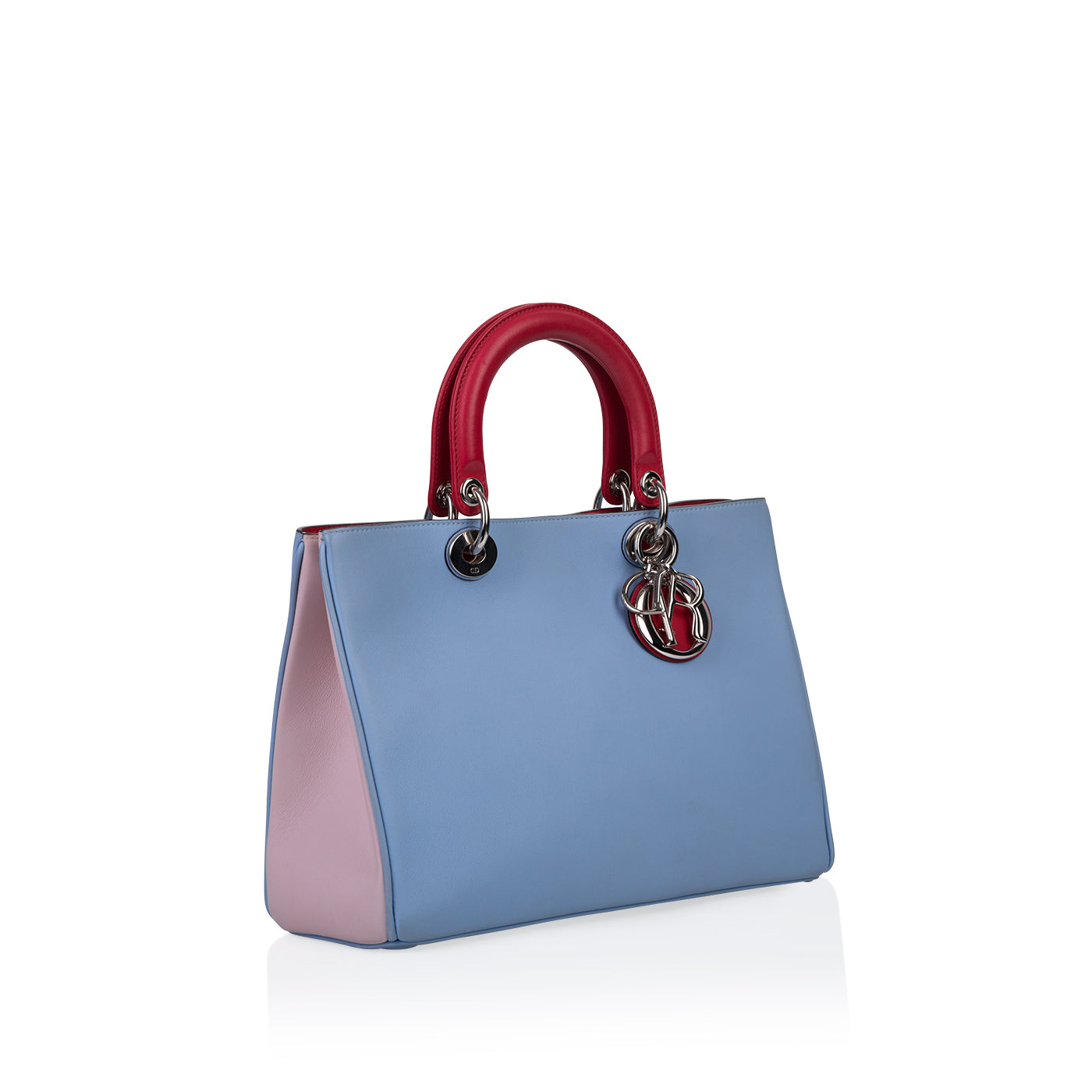 Dior presents their stunning tricolour Diorissimo in a striking colour palette of pale blue, red, and baby pink. Carefully crafted from smooth leather featuring the delicate, silver tone Dior charm, this bag is the ideal accessory for any woman who wants to put some colour in her wardrobe! Hold all your every day essentials inside the spacious interior while carrying the Diorissimo over your arm, or clip the additional shoulder strap on and throw this bag over your shoulder for handsfree usage. The perfect every day bag and compliment to any neutral-toned outfit, the tricolour Diorissimo offers the best of both worlds by combing luxury fashion and practical function.