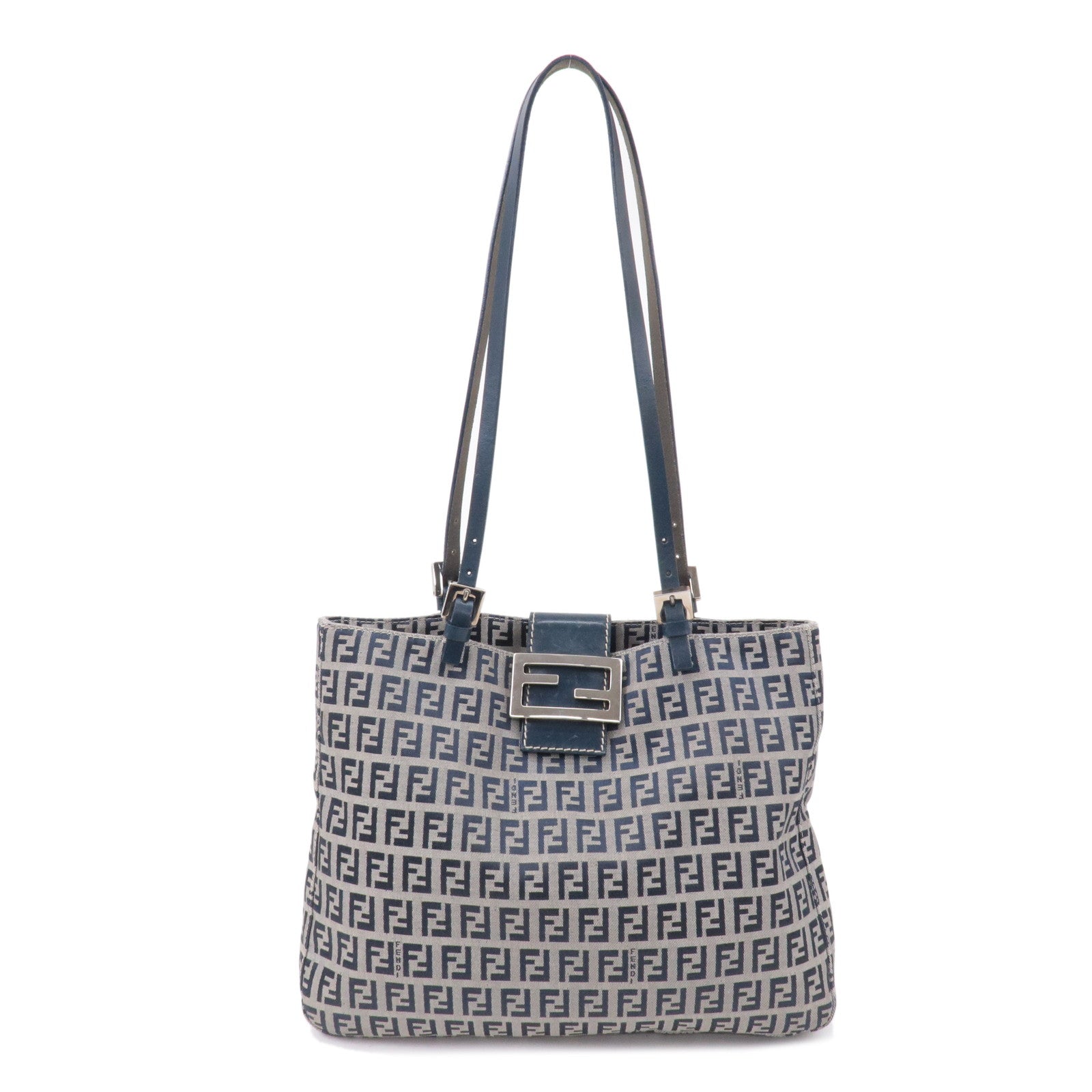 FENDI Zucchino Canvas Leather Tote Bag Beige Navy 26726