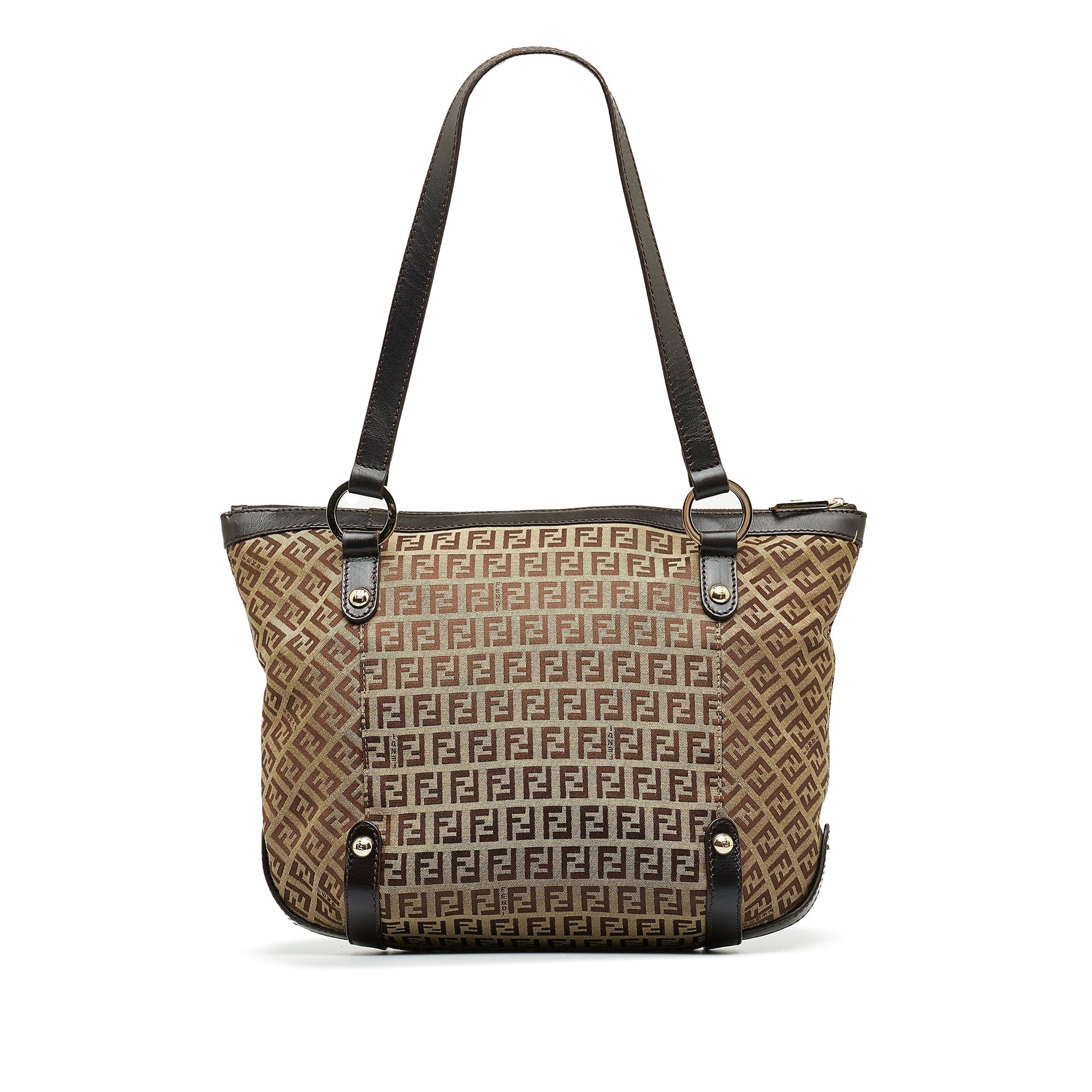 This tote bag features a canvas body with leather trim, flat leather straps, a top zip closure, and an interior slip pocket.