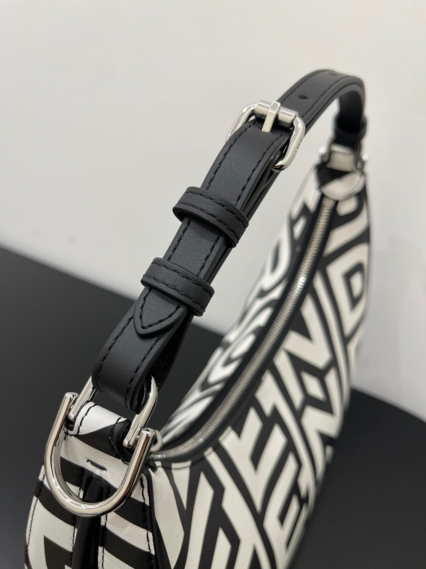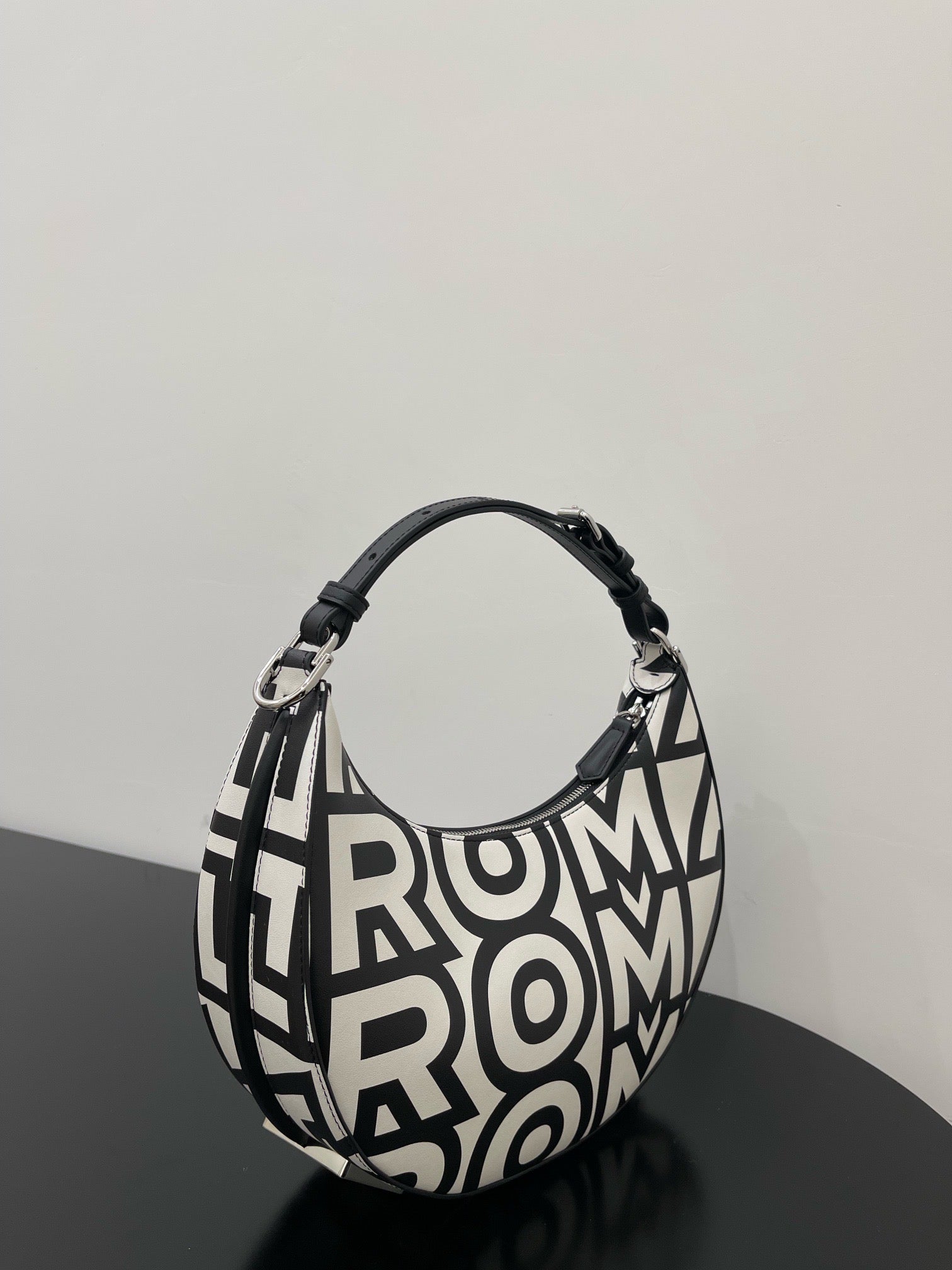 Small hobo bag. Part of the Fendi by Marc Jacobs limited edition, this style is made of soft nappa leather printed with a large version of the Fendi Roma logo all over in black and white. Embellished with FENDI lettering in palladium-color metal, visible when the bag is worn under the arm.