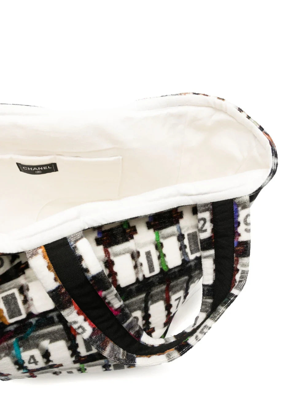 Stay beach ready with this large terry beach tote from Chanel. Boasting a fun geometric print and Chanel logo, this piece is the perfect addition to your vacation wardrobe. Made from cotton, this tote bag is easy to clean and throw in your suitcase.