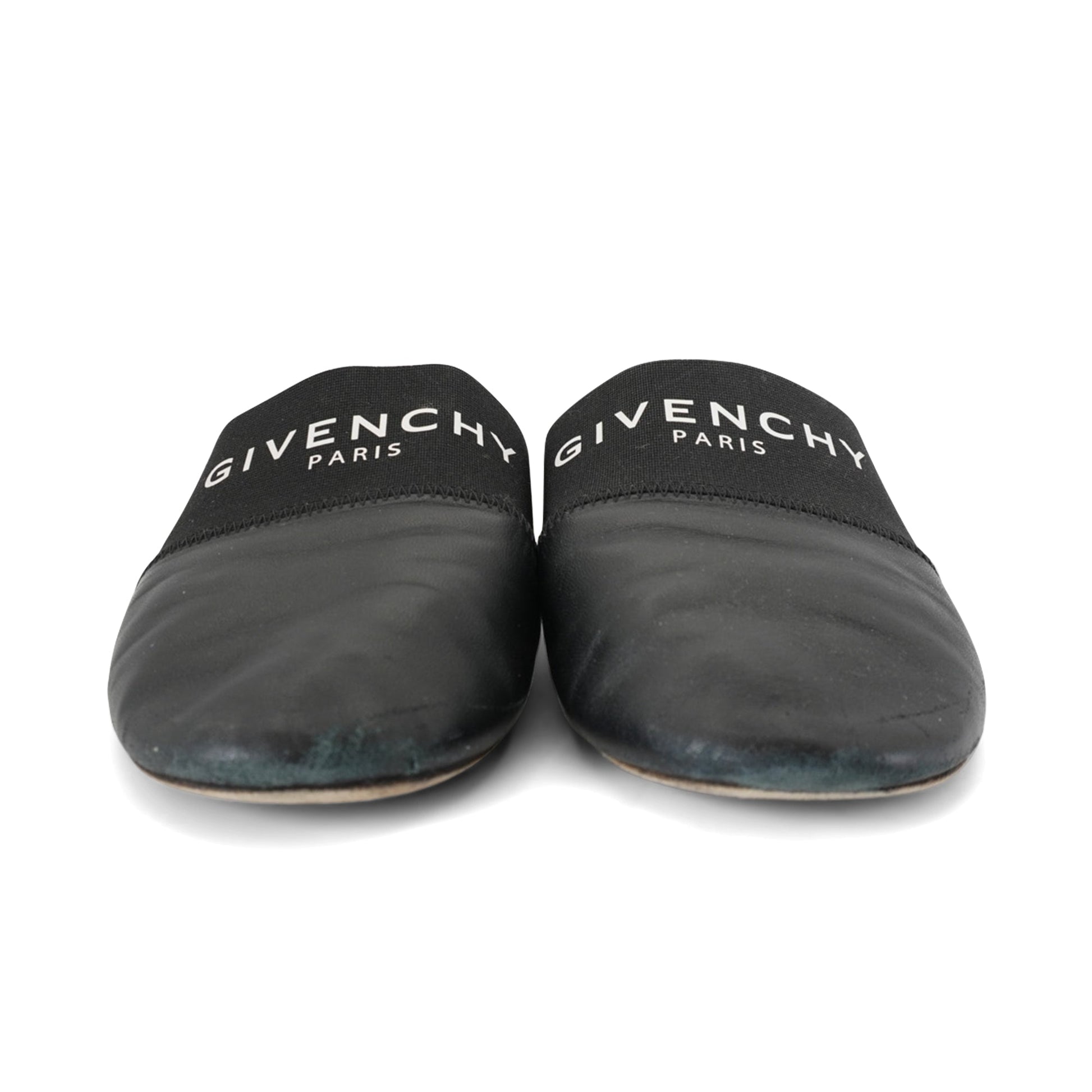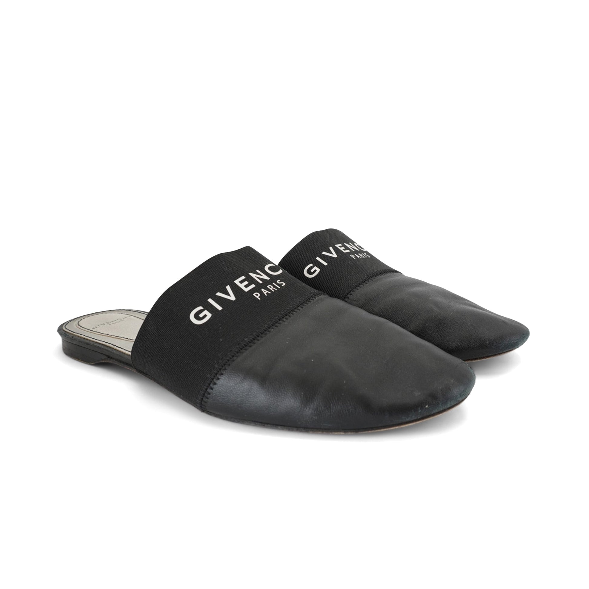 Givenchy 'Bedford' flat mules in black leather with elastic panel featuring a white logo print.