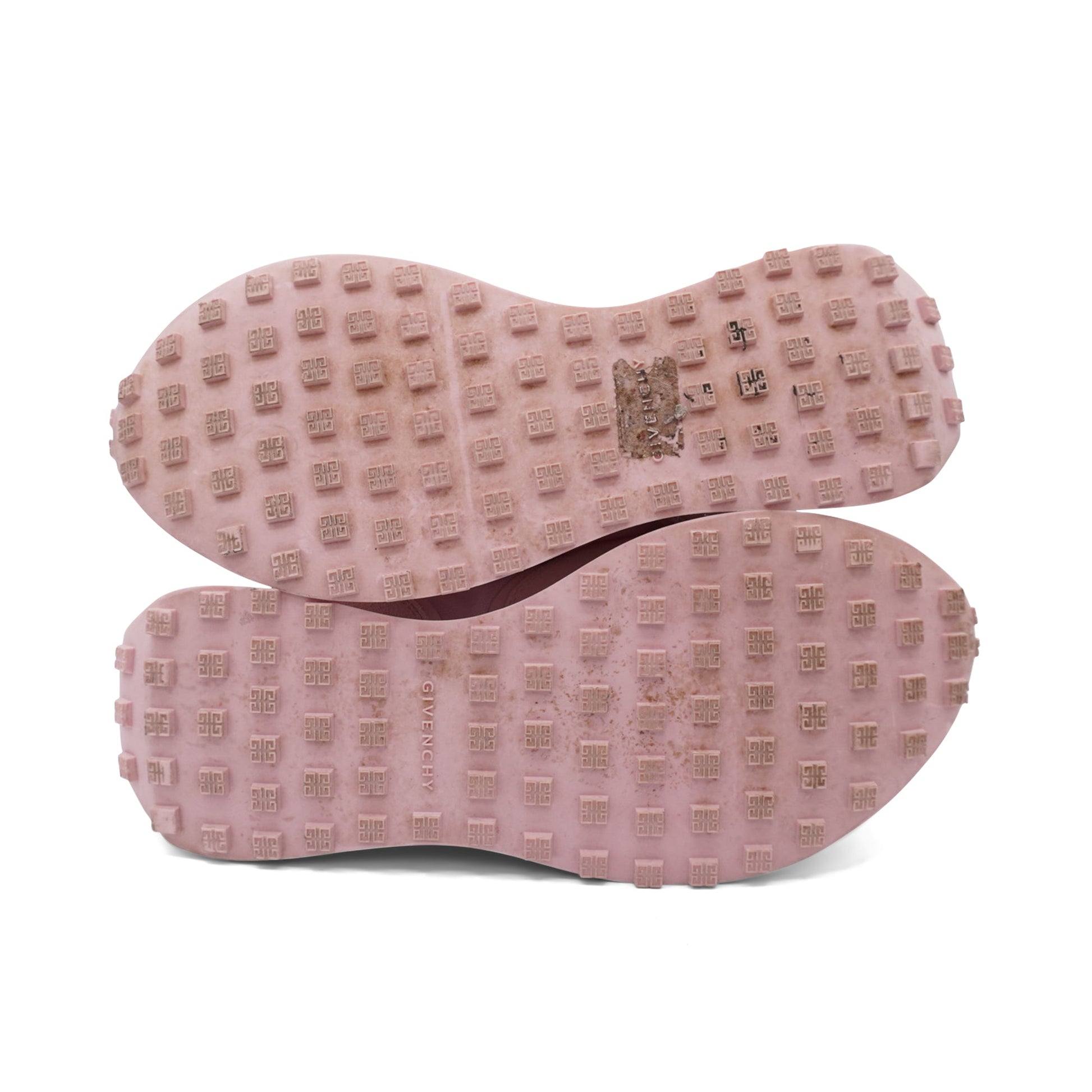 Givenchy 'Giv Runner' sneakers in light pink canvas and suede with a black logo graphic across the sides, silver metal logo hardware on the laces, and a chunky white rubber sole.