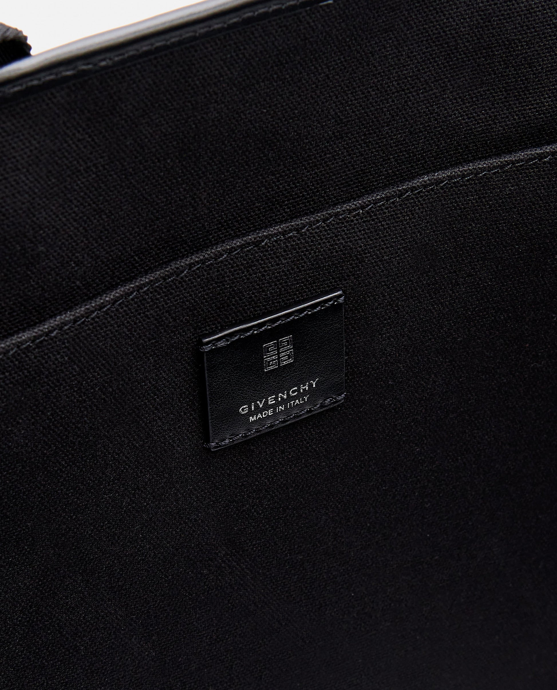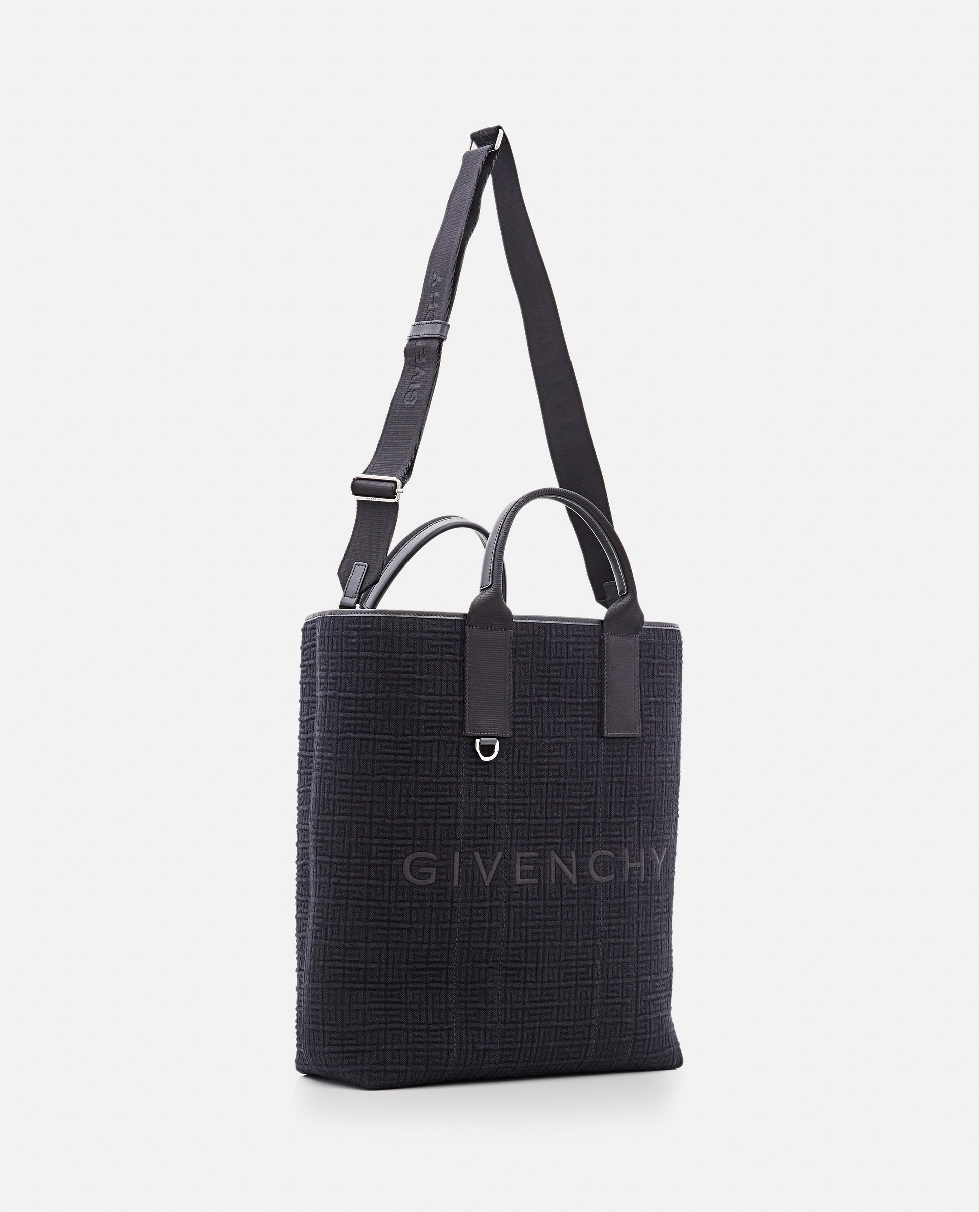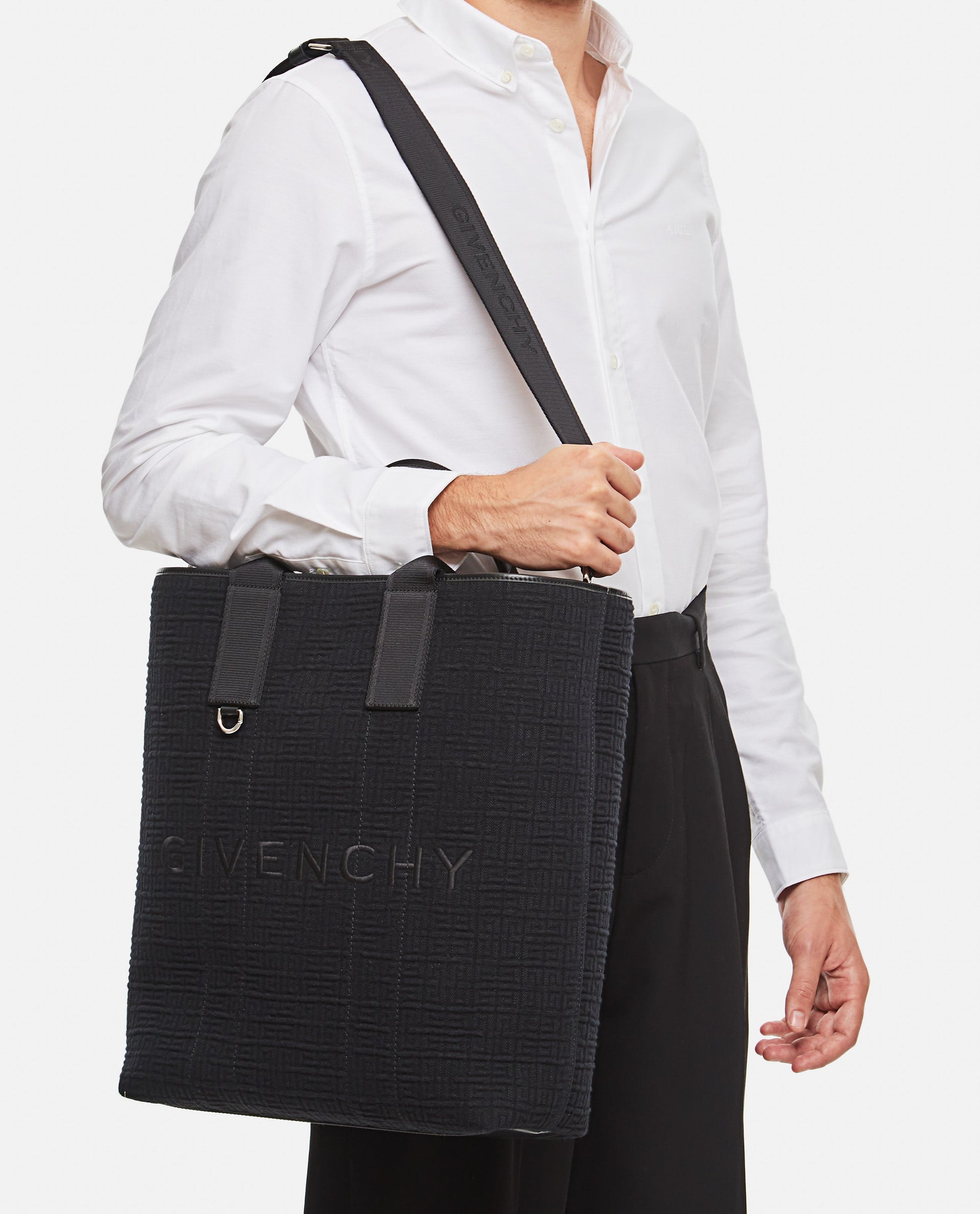 Tote bag in large model. G-Essentials line. Handbag or shoulder bag. GIVENCHY signature printed tone on tone on the front. Two handles. GIVENCHY engraved metal adjustment buckle and calfskin details. Silver finish metal details. Internal flat pocket. Color: black