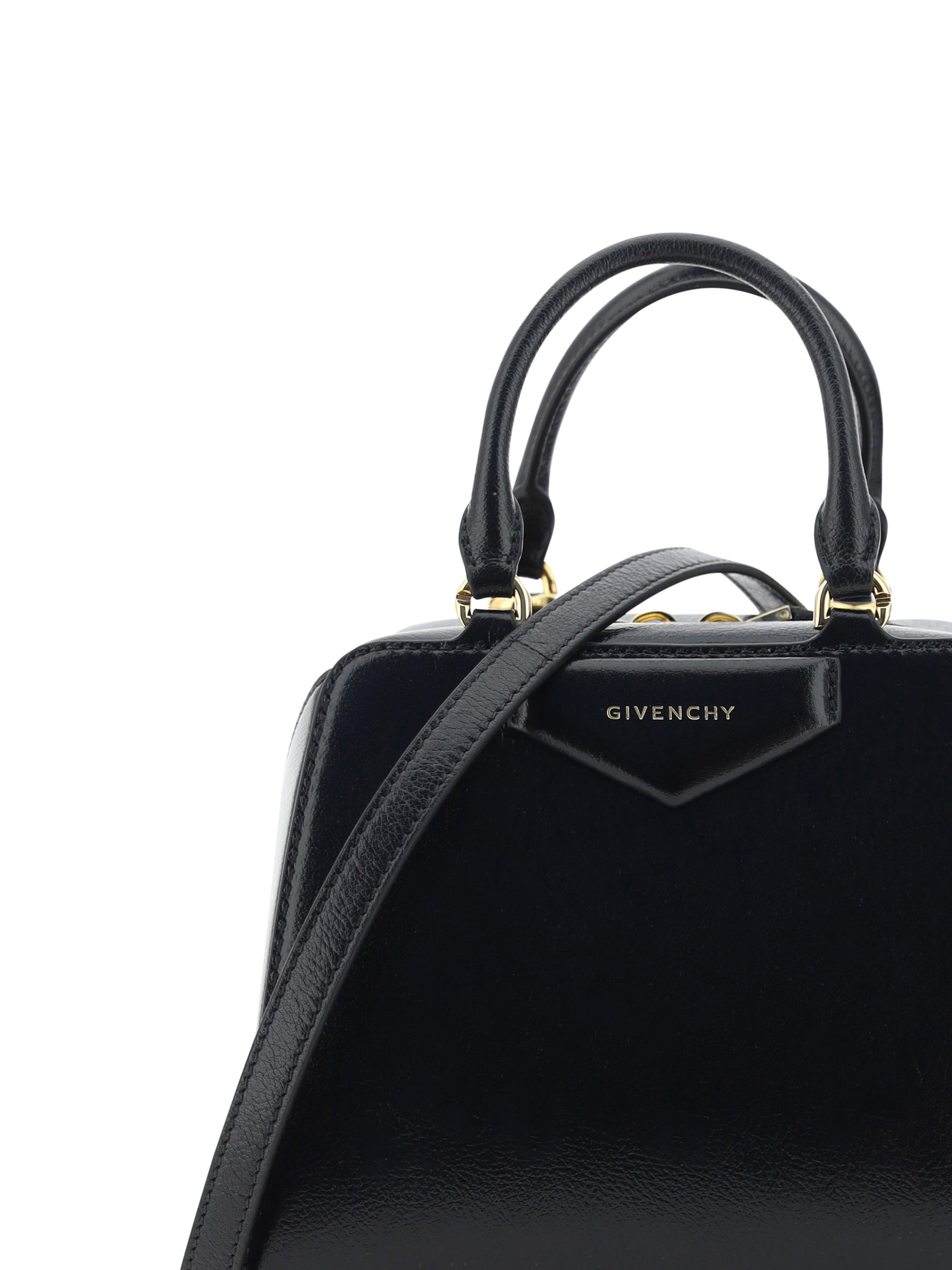 Bufalo Leather Antigona Cube Mini Handbag by Givenchy, grained leather design, geometric pattern, two rigid top handles, top zipper closure with double slider, contrasting iconic brand monogram on front, adjustable and removable shoulder strap, applied support feet at base of bag, iconic three-dimensional brand monogram on front panel.