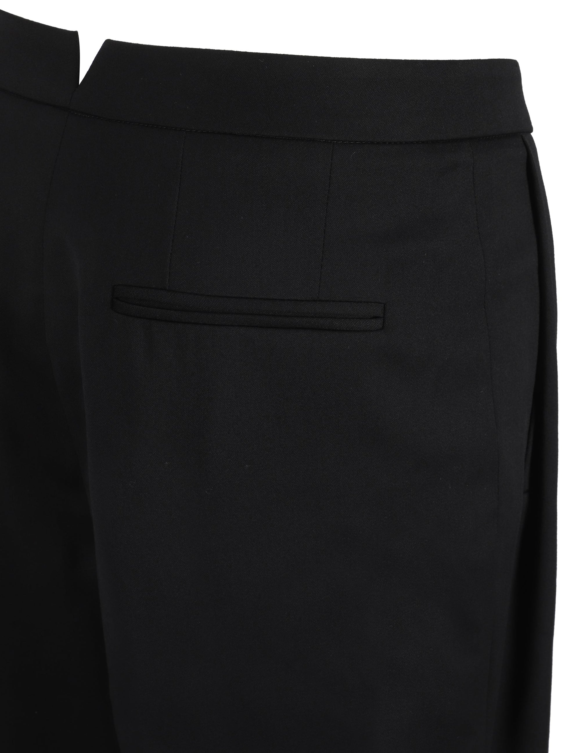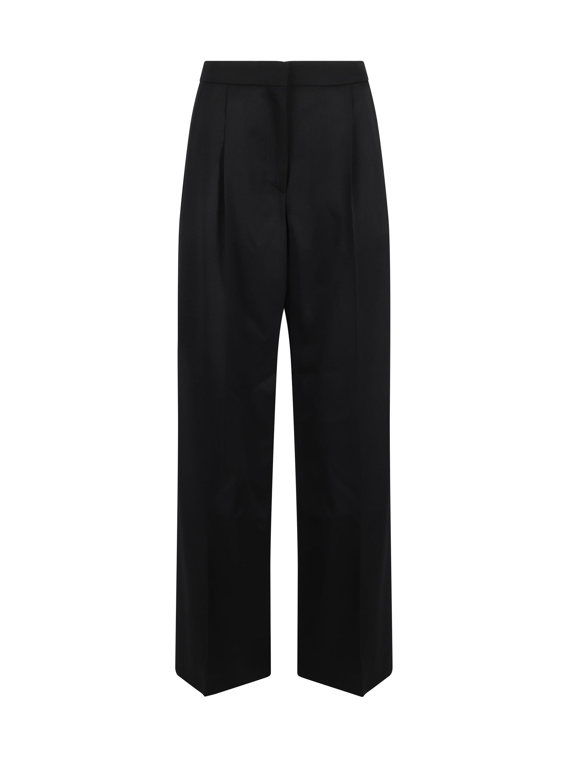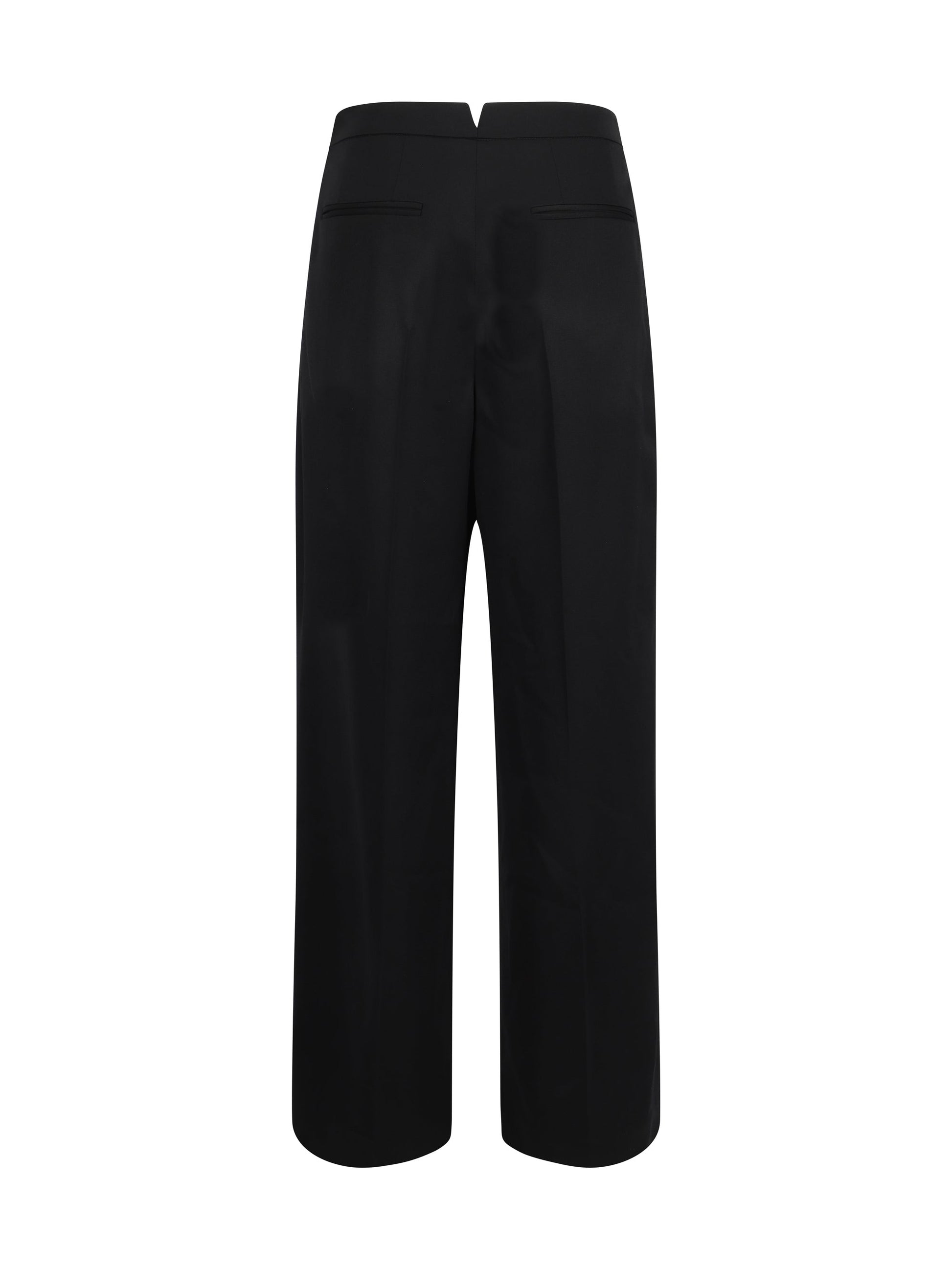 Wool Pants by Givenchy, wide leg style, front button, hook and zipper closure, two side slash pockets, two welt pockets with flap at back, monochrome pattern.