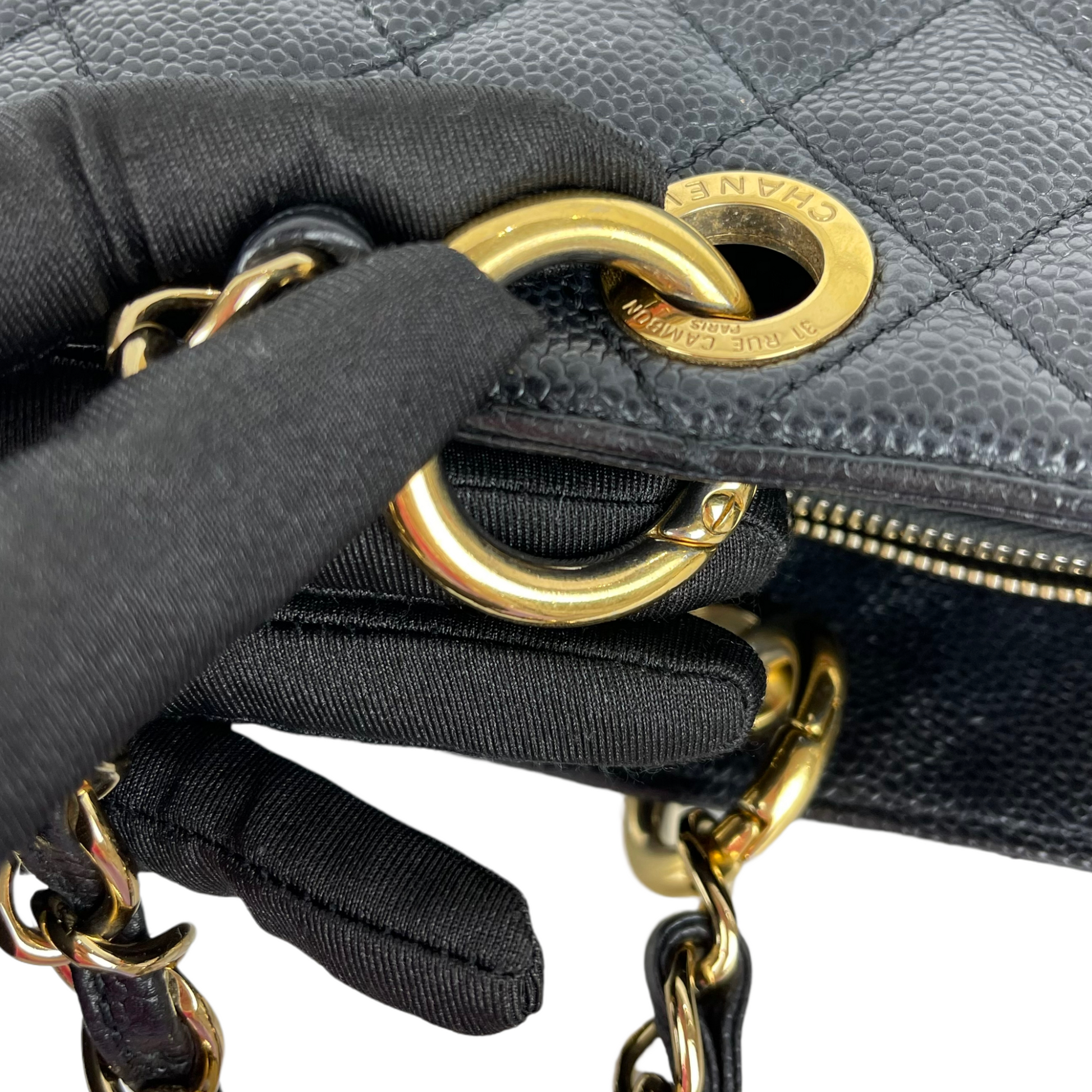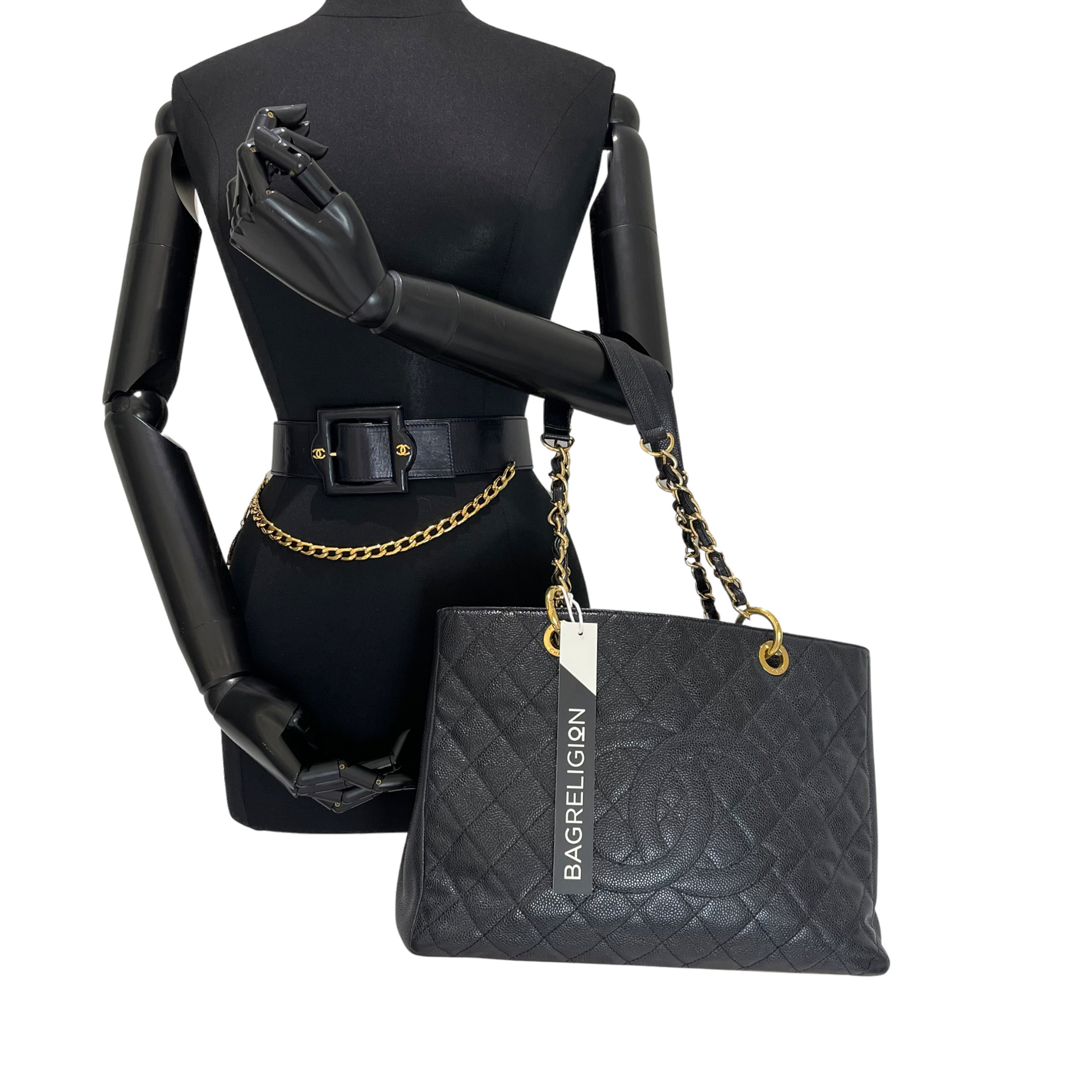 The Chanel Grand Shopping Tote is crafted from classic caviar leather with diamond quilting. It features leather-threaded polished gold chain-link shoulder straps with shoulder pads that accentuates the bblack shade of the bag. This bag’s organized storage system makes it perfect for work, shopping, and even your day or night socials. Be practical AND stylish in Chanel!