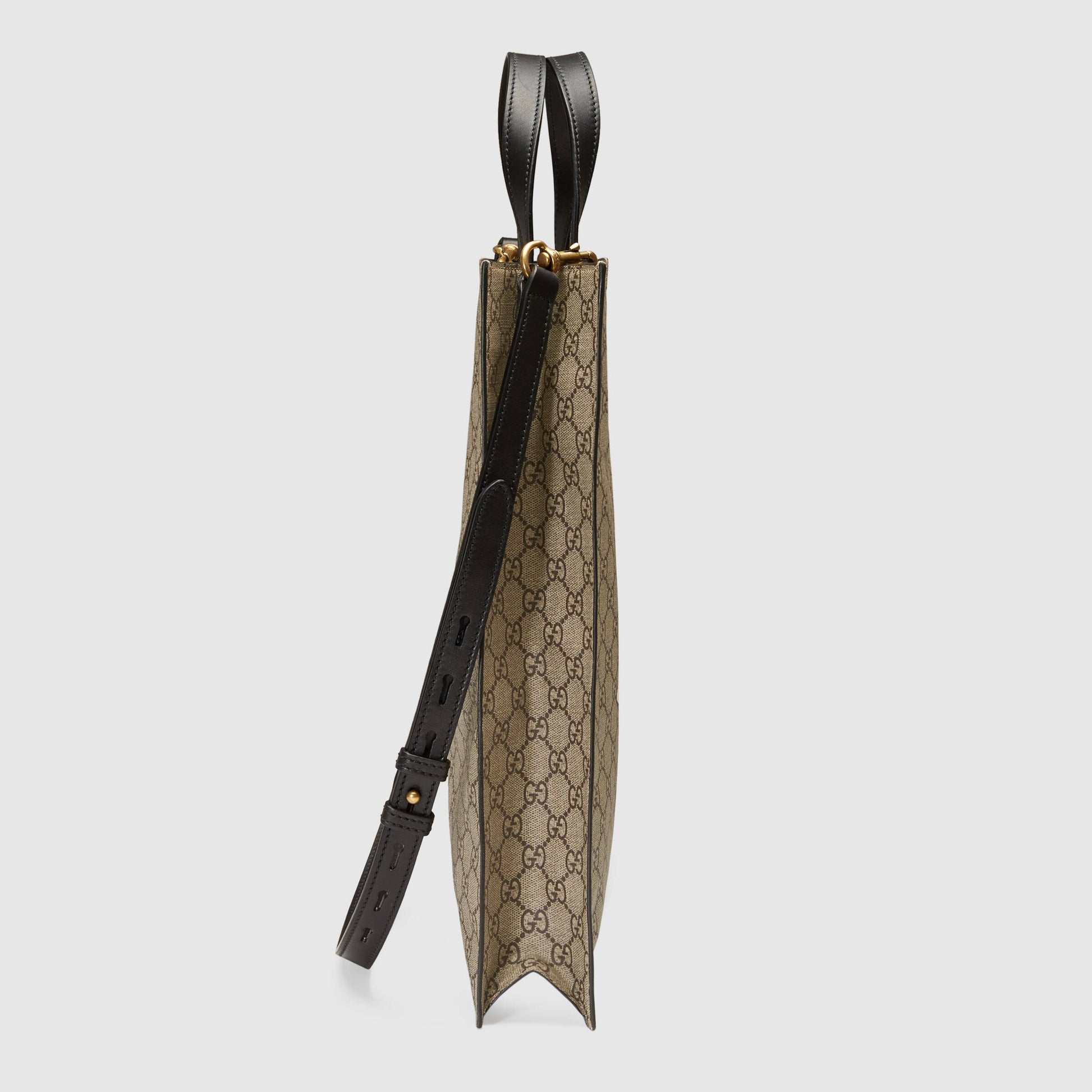 A slim tote with bee and “Blind For Love” prints, made in soft GG Supreme, a softer version of GG Supreme canvas, crafted from a coated microfiber fabric with the GG motif. The bee is an archival code first introduced in Gucci ready-to-wear in the 1970s. Designed to be two additional ways, the tote comes with a removable shoulder strap or can be folded in half to be new as a clutch.