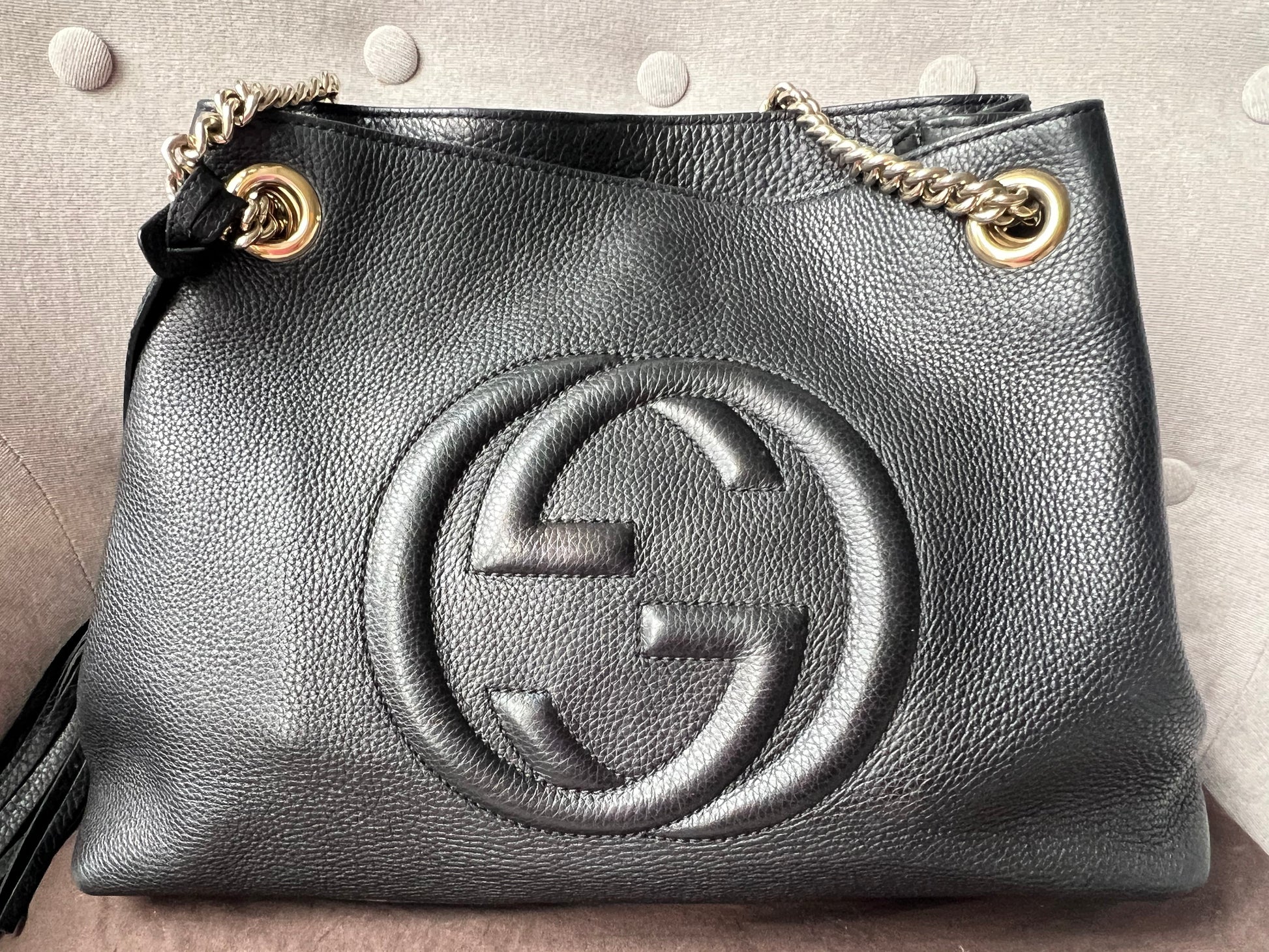 Gucci Soho Chain Tote in Black Grained Leather with pale gold hardware. This roomy tote features chain straps with leather sections and is ideal for day to day use. Can fit comfortably over the shoulder or can be carried in the crook of the arm. Roomy in size and somewhat slouchy in shape.