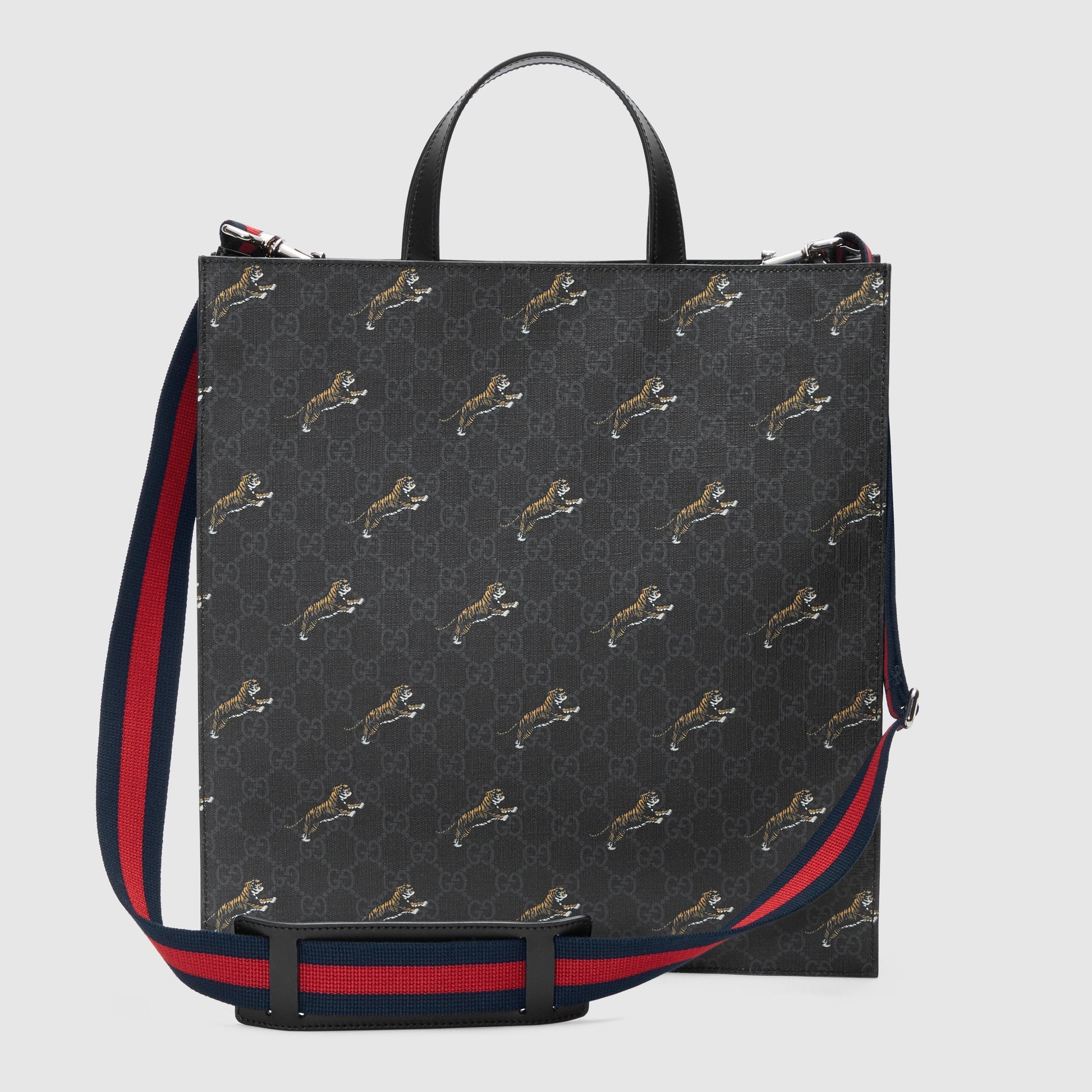 The Tote is reimagined for Pre-Fall 2019 with the season’s printed GG. Leaping tigers are scattered across a soft GG Supreme base, contrasting against the black and grey combination of the emblematic House pattern. The carry-on is finished with a zipper closure, leather trims and removable blue and red Web strap.