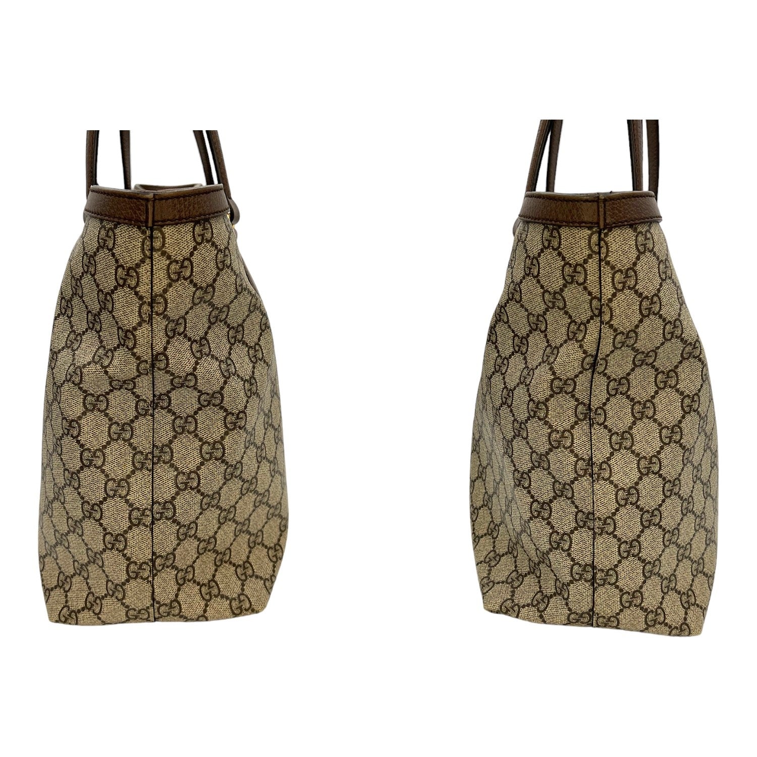 This Gucci GG Supreme Medium Ophidia Tote was made in Italy and it is finely crafted of the classic Gucci GG Supreme coated canvas exterior with leather trimming and gold-tone hardware features. It has a magnetic top closure that opens up to a very spacious suede interior with a slip pocket and a zipper pocket. It has dual leather shoulder straps and it is certified by Entrupy!