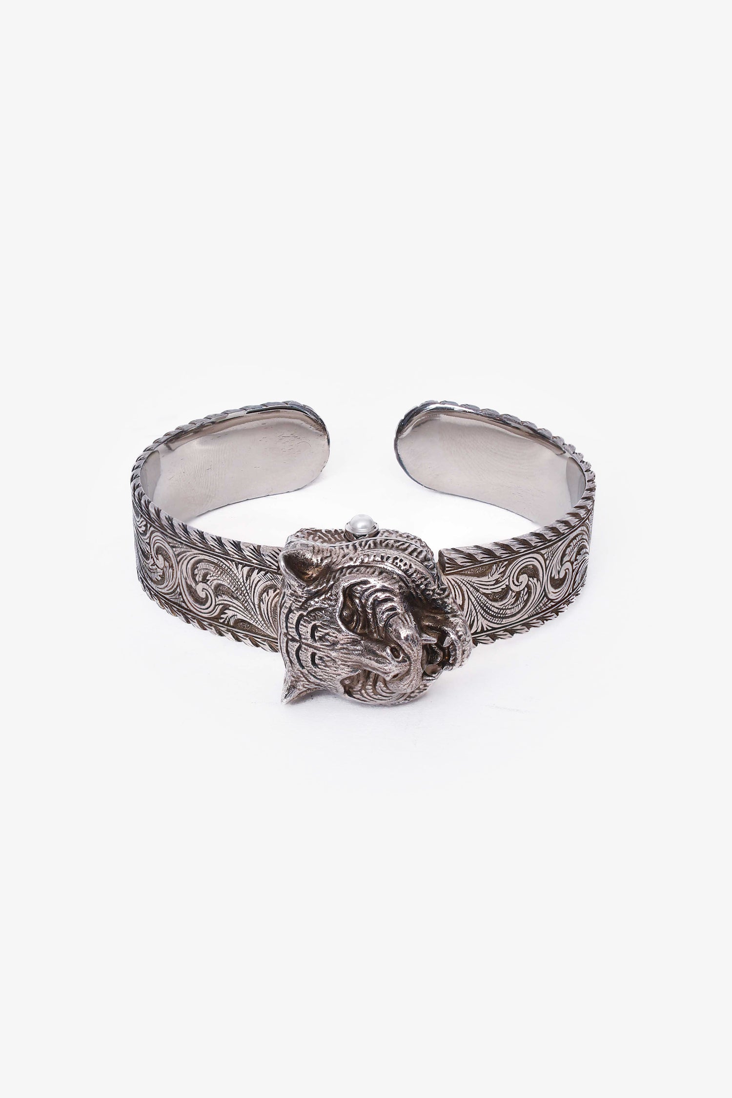 Gucci Stainless Steel 'Le Marché Des Merveilles' Secret Bracelet Watch. Slip-on. Twist-away tiger head. Round watch face. Silver-toned.