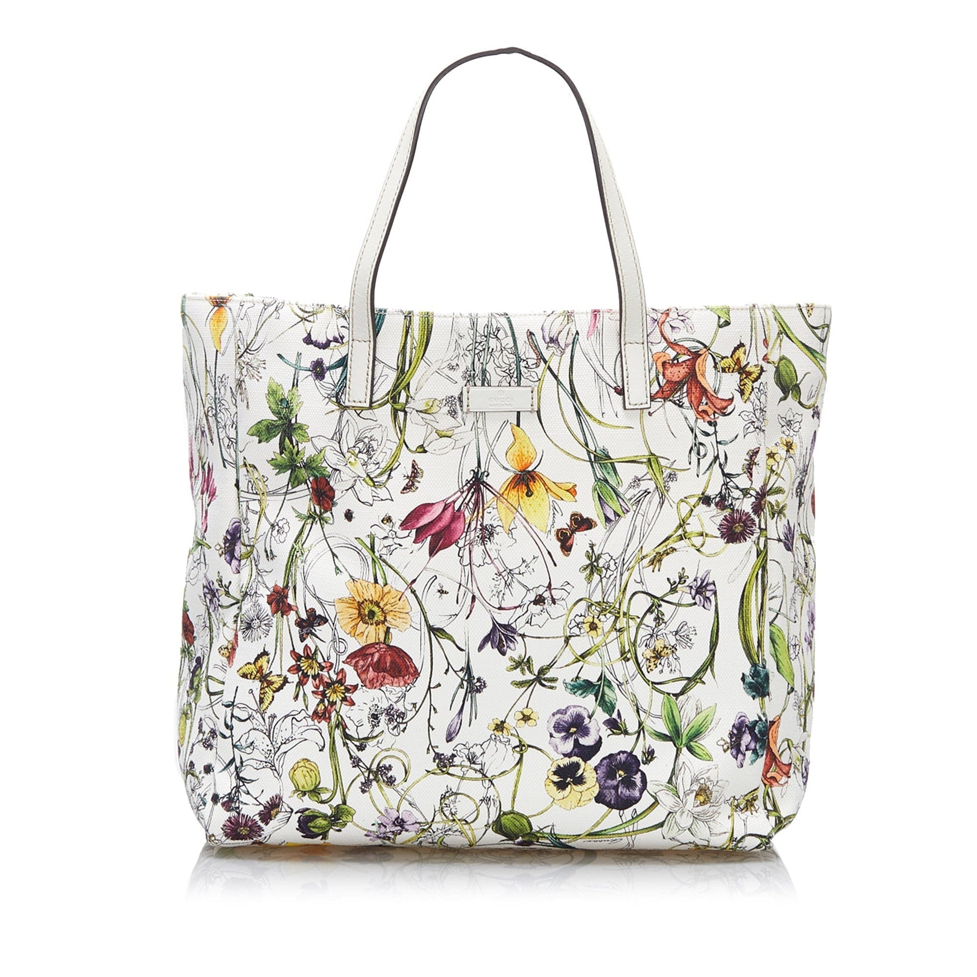 This Gucci Tote Bag is made of white canvas and features a flora print and logo patch on the front. The Bag is open at the top and features a main compartment and an interior zippered pocket. With its flat handles, it is best carried on the arm and in the hand.