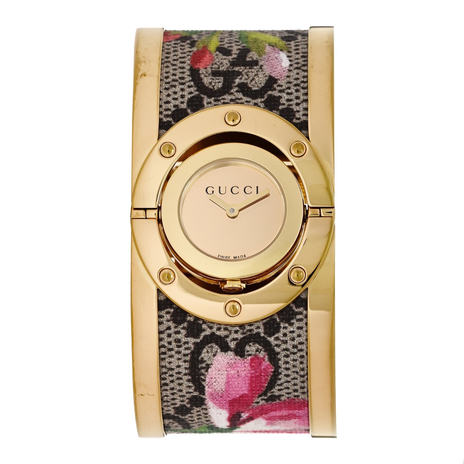 This stylish women's watch from the Gucci Twirl collection is both luxurious and playful, from its wide Guccissima fabric-covered bangle bracelet to its rotating 24mm yellow-gold-tone sun-brushed dial set in gold-tone-PVD-coated stainless steel. A scratch-resistant sapphire crystal protects the Swiss-made quartz movement. This lovely timepiece is secured with a jewelry clasp. Please note: Guccissima fabric is not water-resistant.