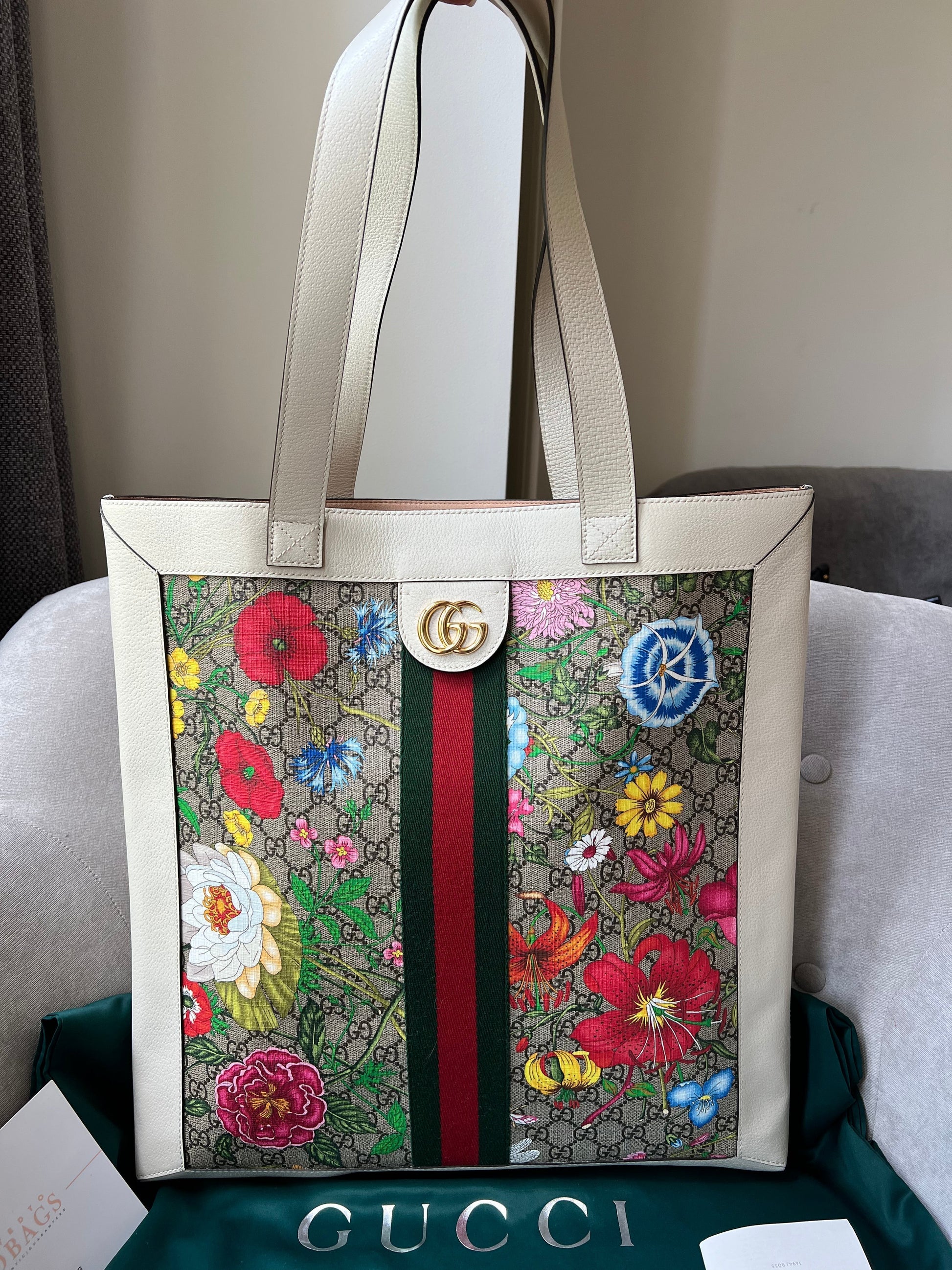 Gucci Flora Large Ophidia Shopping Bag in Canvas with floral print and white leather trim. Gold hardware. It features the gold metal GG logo on the front and green/red/green stripes on the front and back. It also features double top flat leather handles and open top. Perfect day to day bag for those who prefer a larger sized bag. Can be over shoulder or carried in hand.