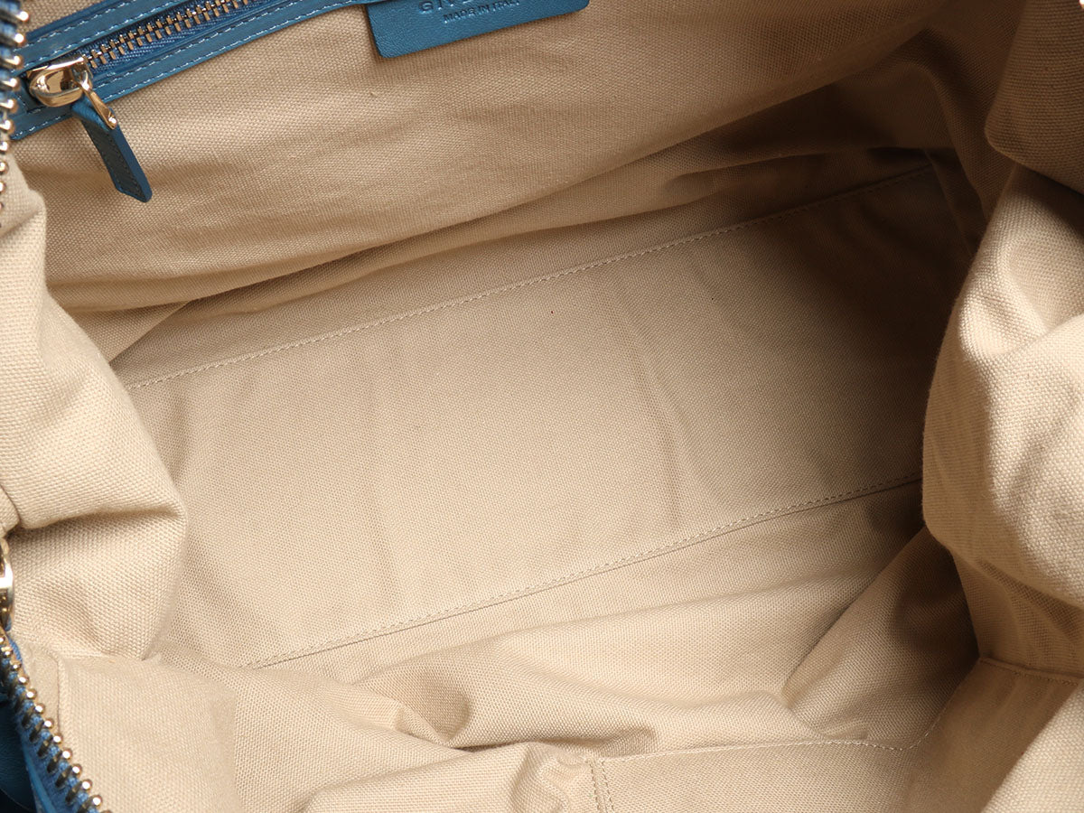 Givenchy’s Medium Blue Nightingale has logos embossed where the handles with their three inch drop attach to the lambskin bag! Coming with a dustbag, tag, leather sample, and shoulder strap, there is wear on the corners, hardware, and on the leather where the back and handles seem lighter in color. Double gold zippers open the top to a beige fabric lining with two slide pockets and a zipped pocket inside. Lightly textured leather in a lovely shade of blue!
