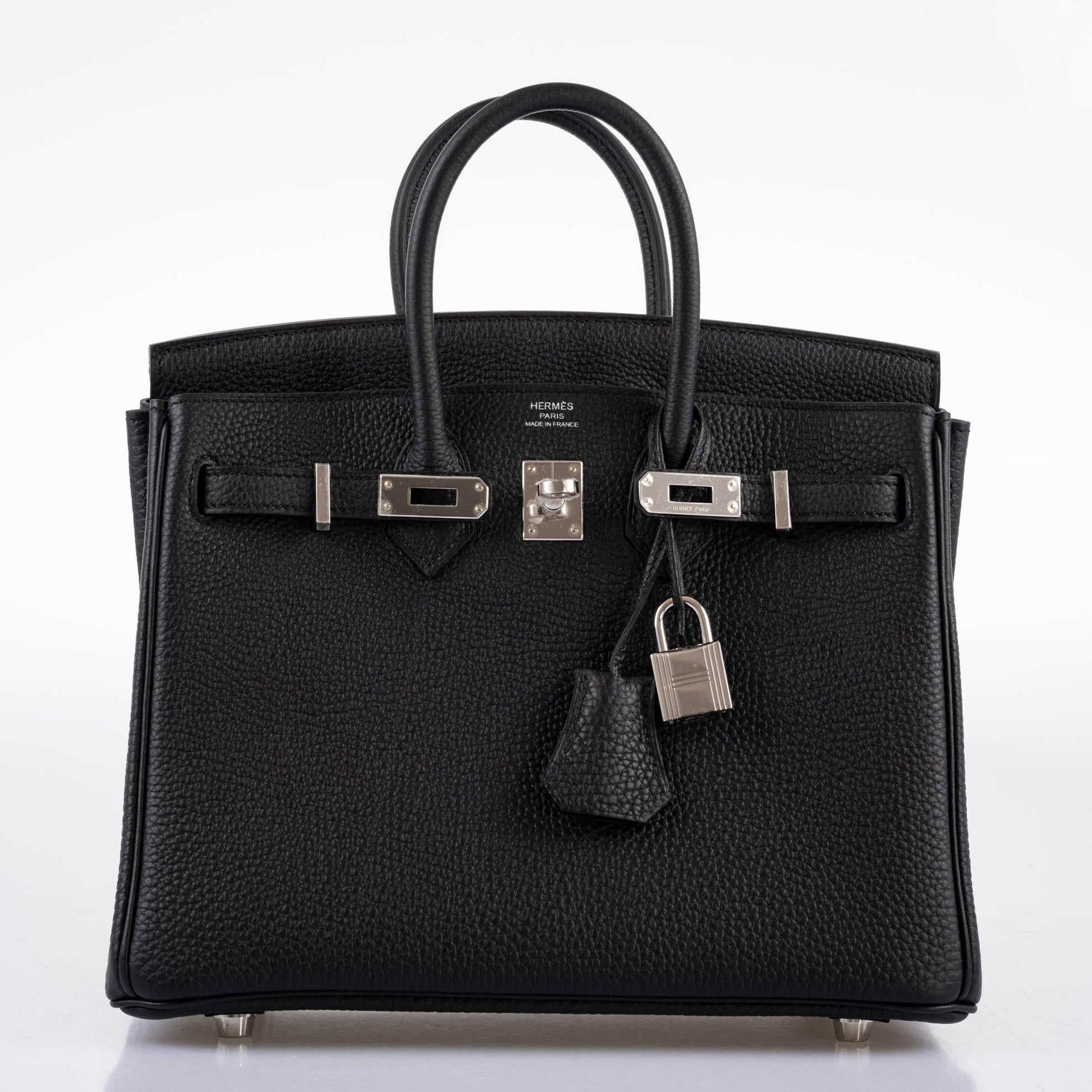 Birkin bags are known for being hard to get, always ‘sold out’ in stores, being offered even a simple leather Birkin is never d. The black Togo Birkin 25cm is a forever staple in your collection, especially with Palladium Hardware. This Birkin features front toggle closure, clochette with lock and two keys, and double rolled handles. The interior is lined in chèvre black leather.