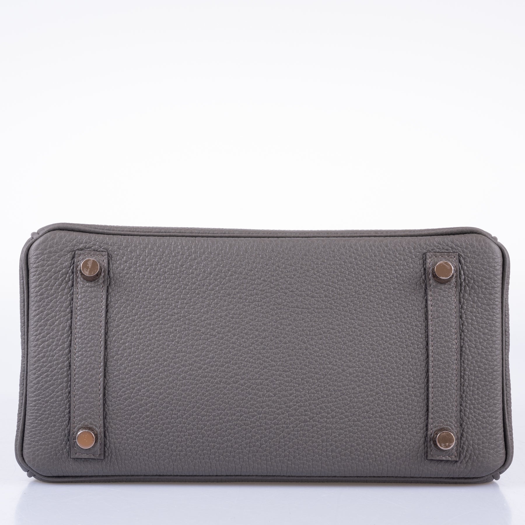 Birkin bags are known for being challenging to get, always ‘sold out’ in stores, being offered even a simple leather Birkin is never d. This rare tin grey Etain Togo leather Birkin 25cm is a forever staple in your collection. Super Rare Introduced in the 2011 Autumn Winter collection, “Etain” refers to "tin" in French. This matte grey is effortless day or night.