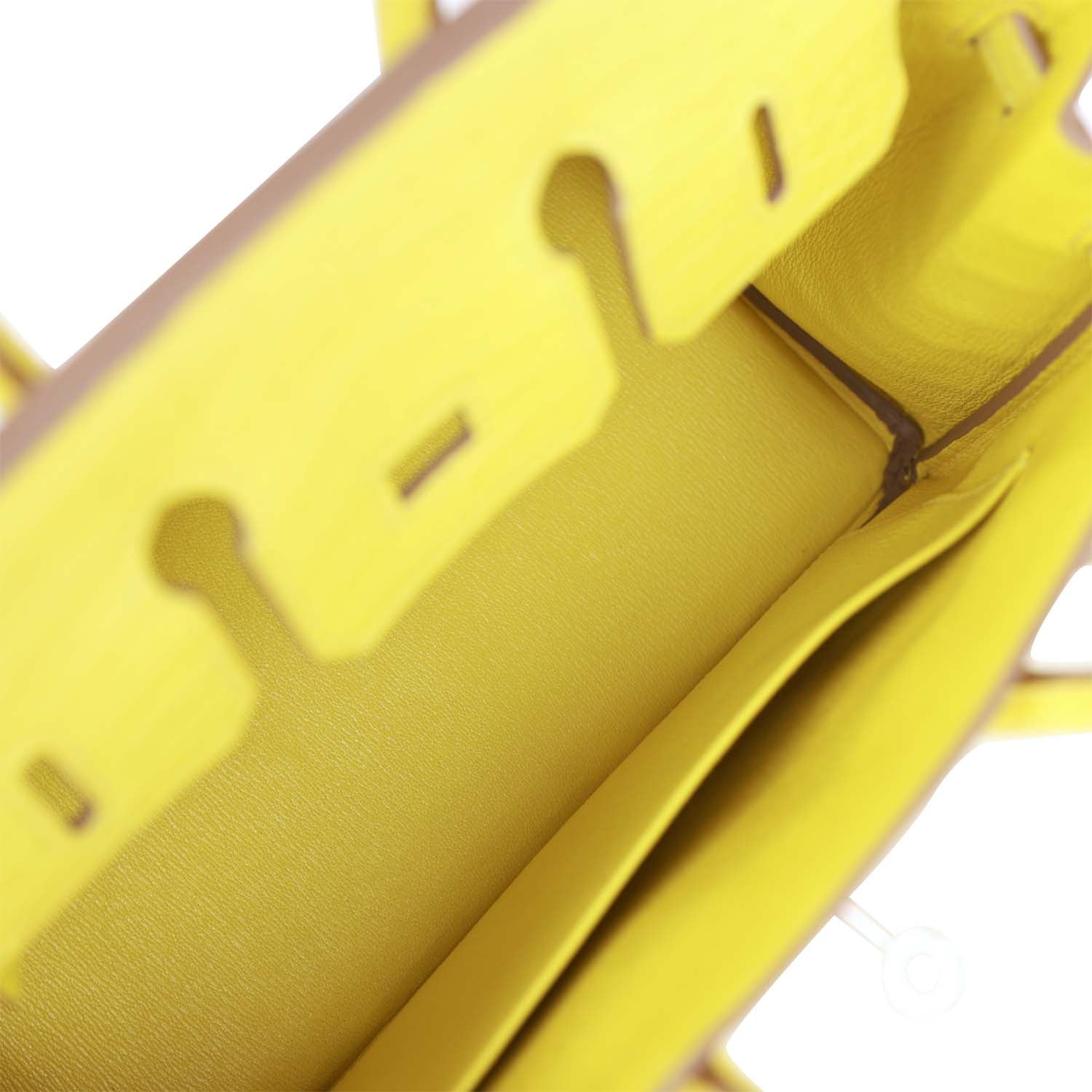 The interior is lined with lime chevre and has a zip pocket with an Hermes engraved zipper pull and an open pocket on the opposite side.