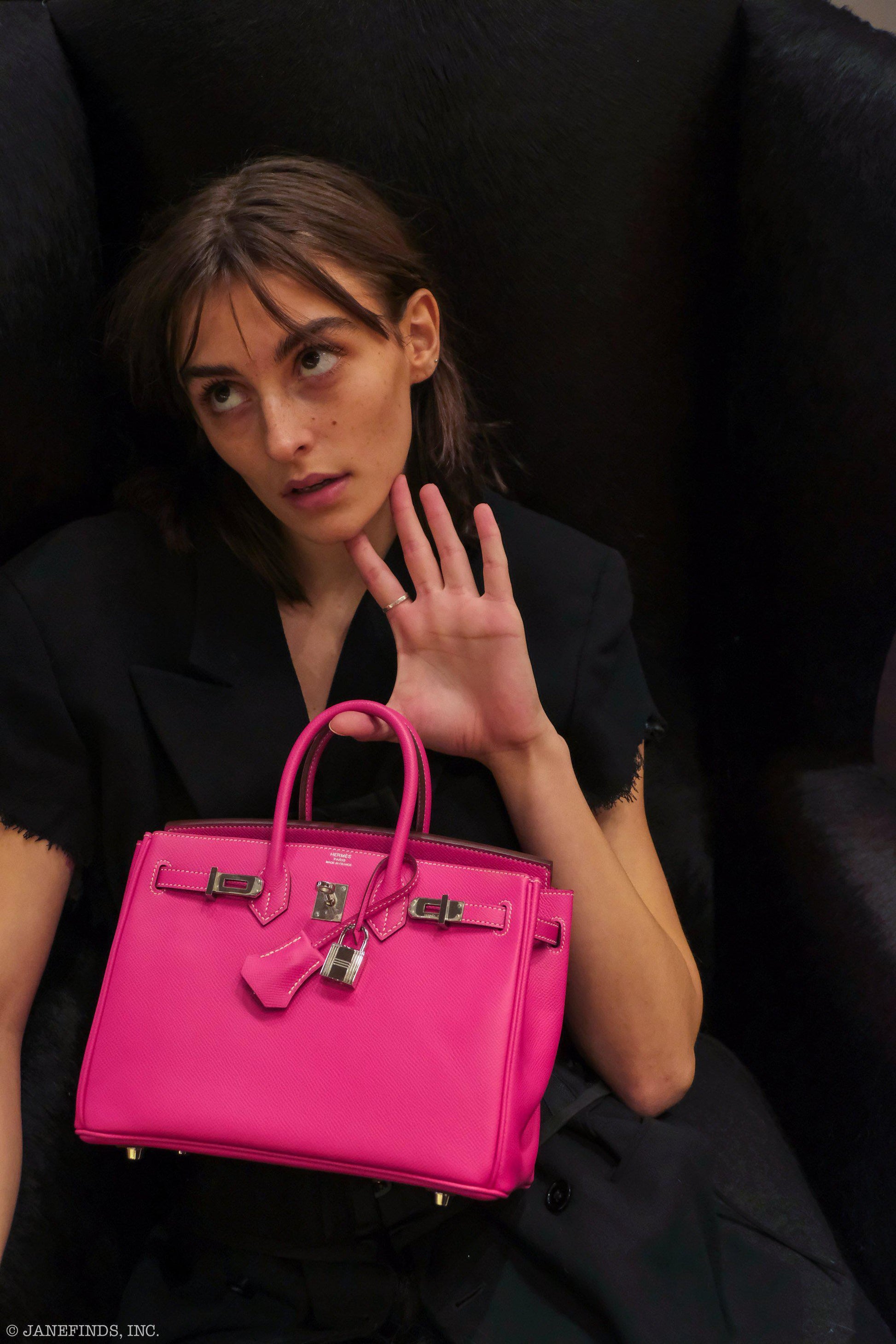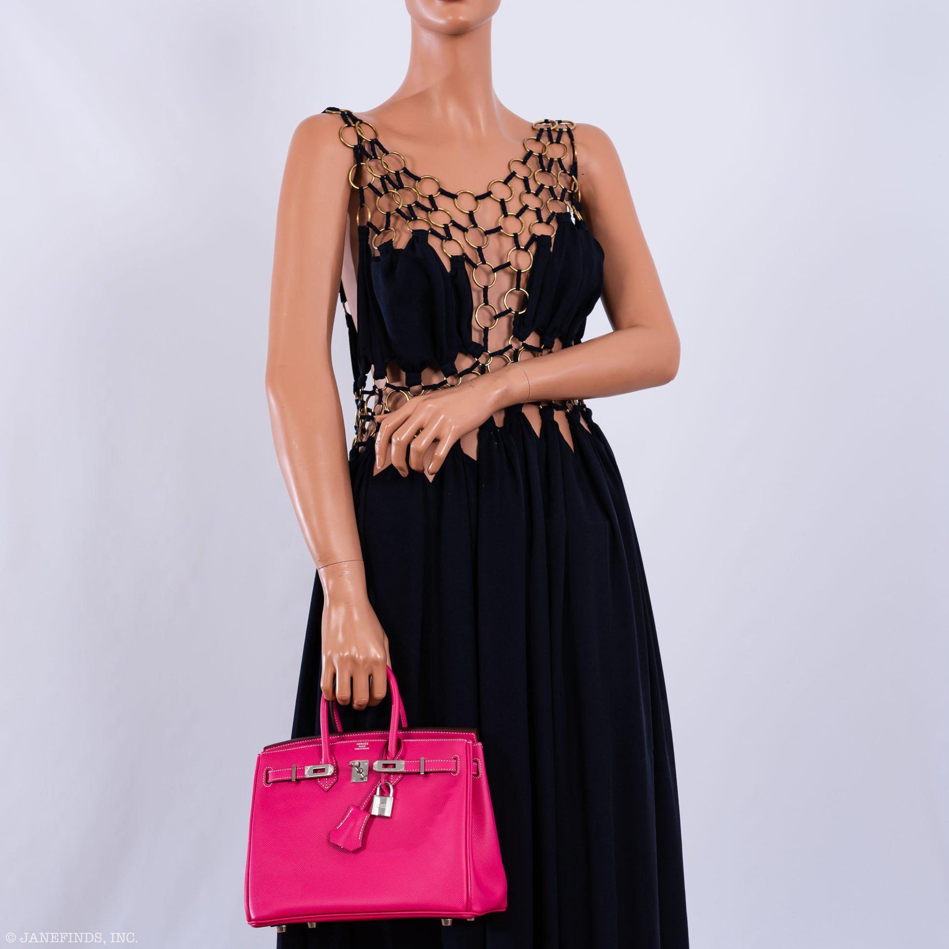 Rose Tyrien was the standout shade of pink Hermès introduced for their famous Candy Collection back in 2011. It has long been the most vibrant and neon shade of pink in Hermès’ repertoire, and actually glows bright under a blacklight, as you’ll find if you ever bring this bag to a club! This 25cm Epsom Birkin is a Pristine (plastic on hardware, not on feet) example that shows off the color incredibly well, framed by the shade’s white contrast stitching and bright gold hardware.