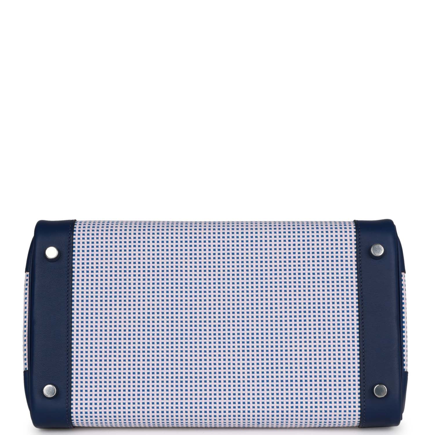 This Hermes Birkin 30 is in Ecru Mauve Quadrille Canvas and Bleu Saphir Swift leather with palladium hardware, tonal stitching, front flap with two straps, front toggle closure, double rolled handles, clochette, lock, 2 keys