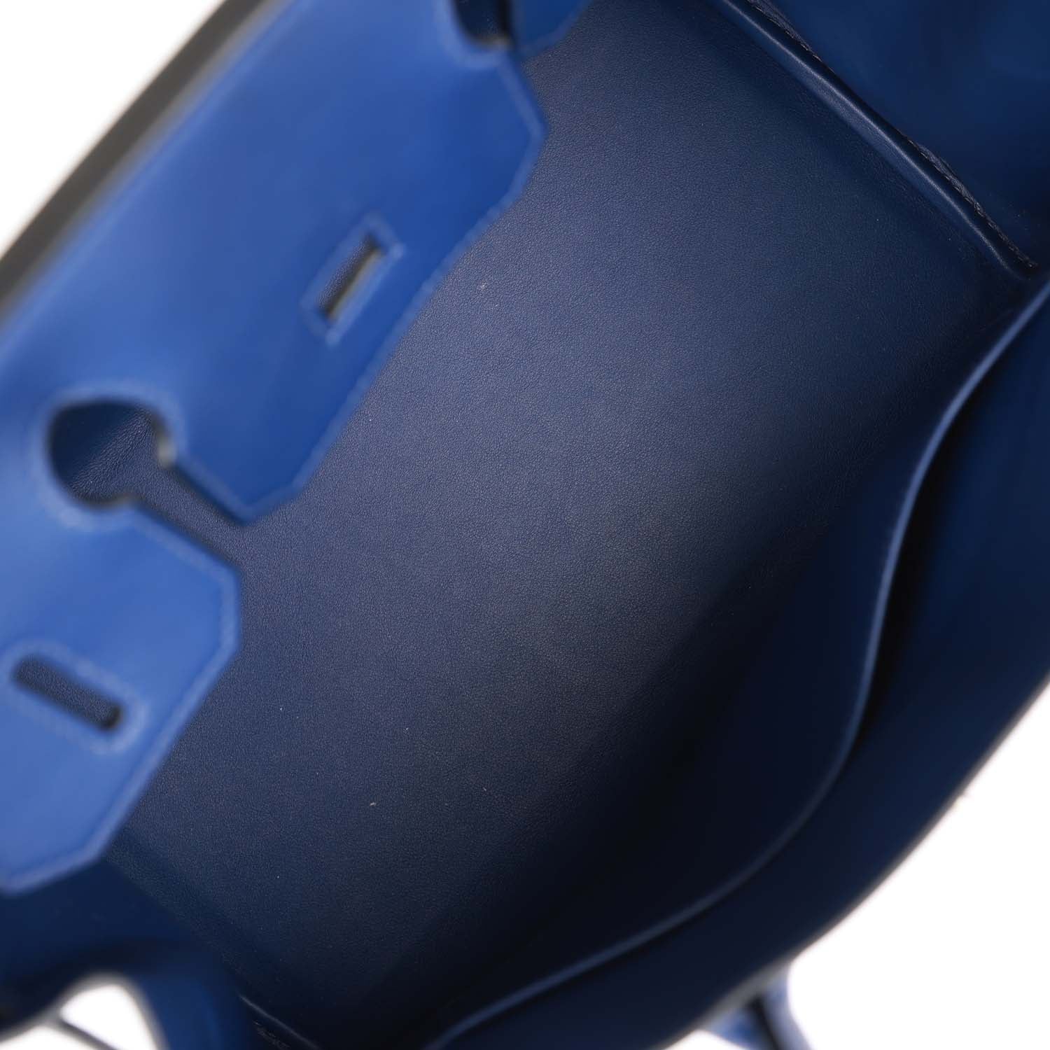 The interior is lined with Bleu Saphir chevre and has one zip pocket with an Hermes engraved pull and one open pocket on the opposite side.