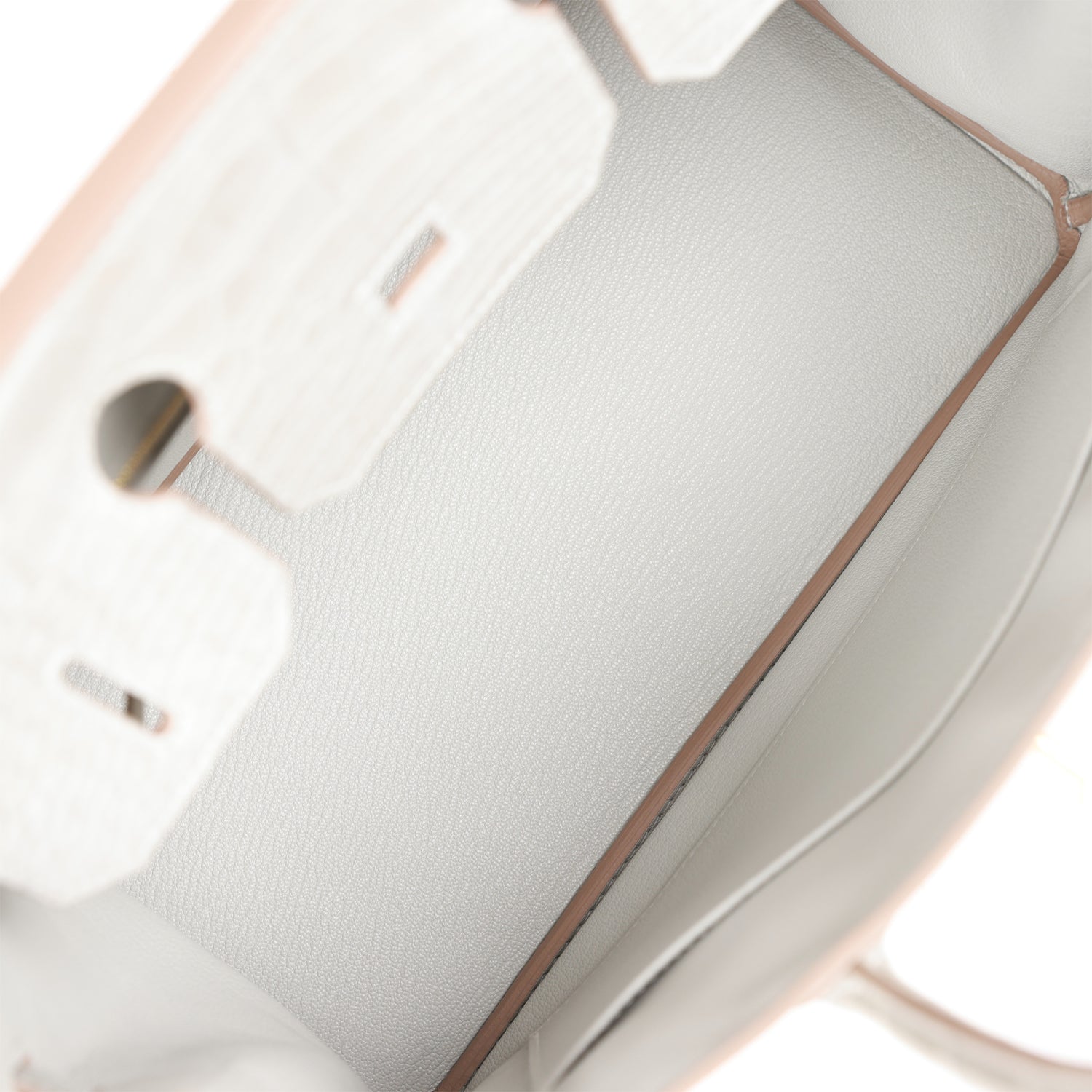 The interior is lined with Gris Perle chevre and has one zip pocket with an Hermes engraved zipper pull and an open pocket on the opposite side.