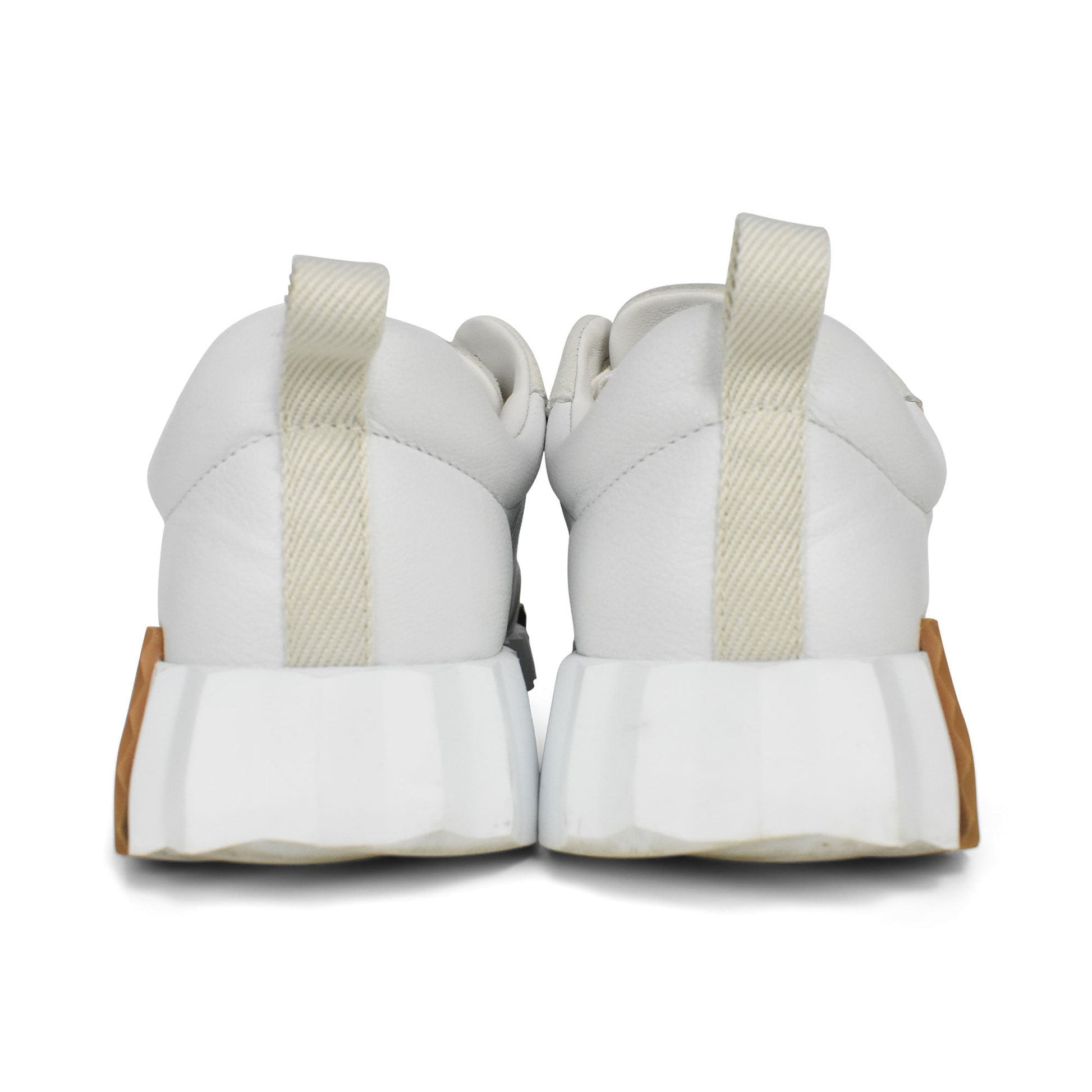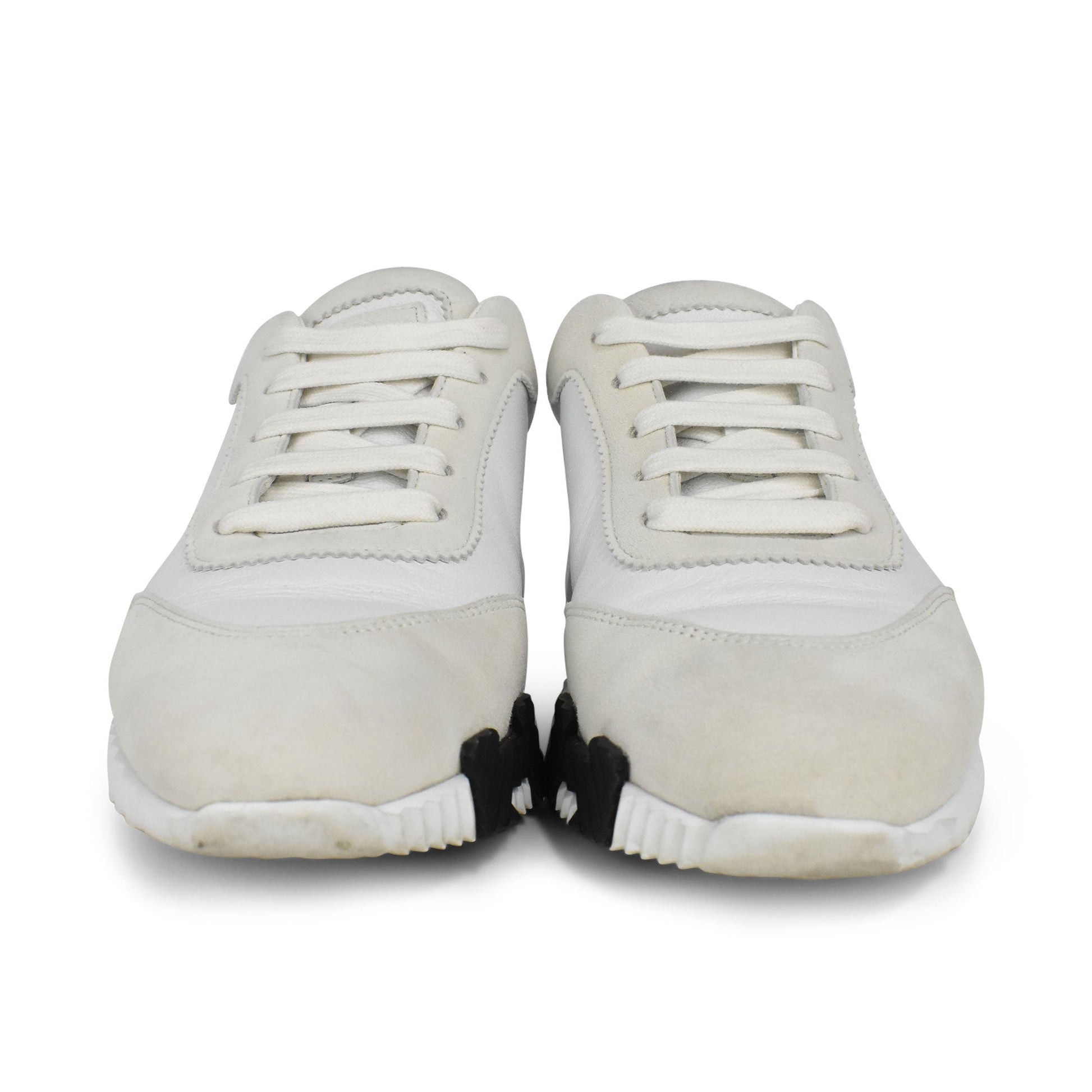 Hermes 'Bouncing' sneakers in white leather with cream suede trim, ribbed soles, and a black and brown 'H' detail embedded into the soles.