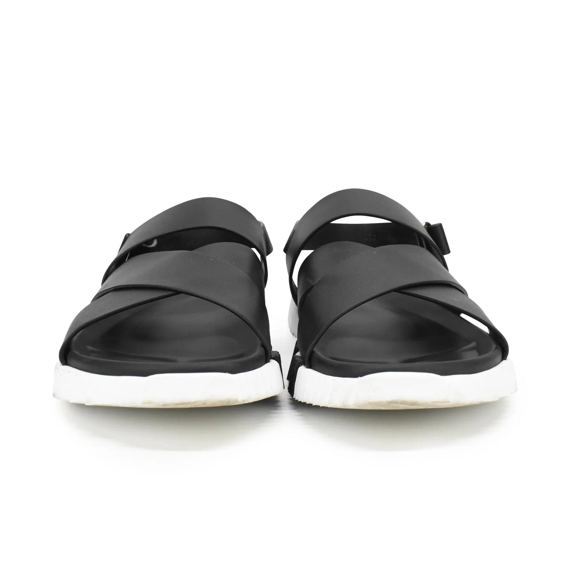 Hermes 'Electric' sandals in black with white soles. Features criss-cross straps, a velcro strap closure around the ankle, an embossed logo, and a ribbed white sole with black 'H' on both sides of the shoe.