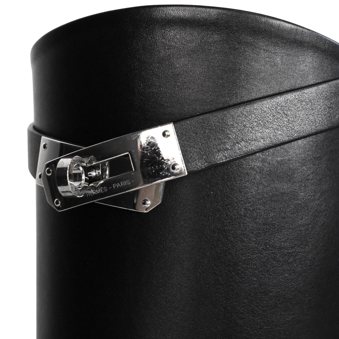 Hermes 'Jumping' calf-high boots in black smooth leather with an almond toe and a top strap with silver signature turnlock hardware.