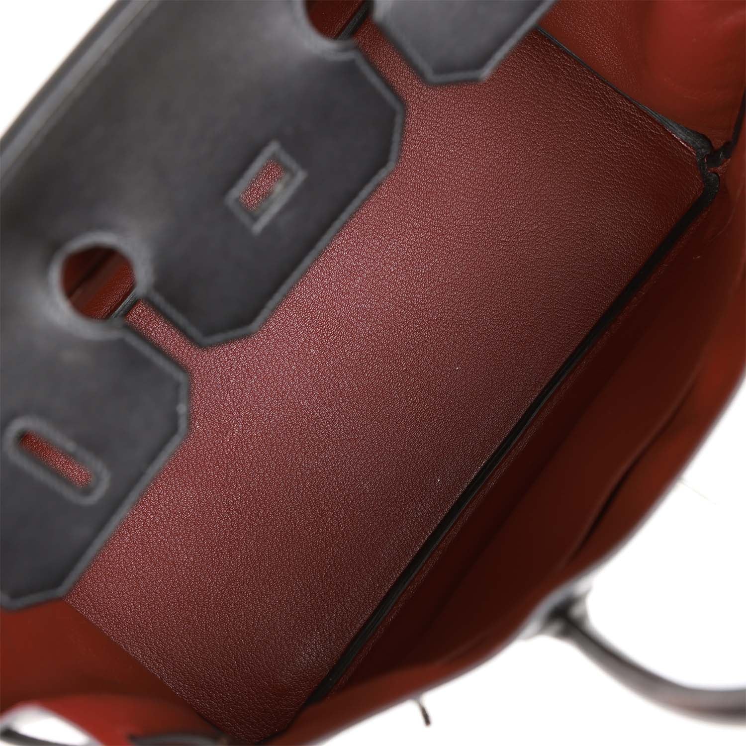 The interior is lined with a Rouge H chevre leather and has one zip pocket with an Hermes engraved zipper pull and an open pocket on the opposite side.