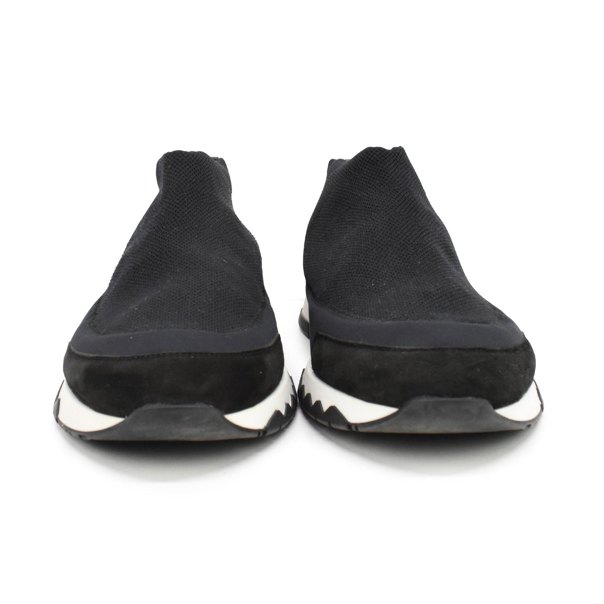 Hermes 'Tokyo' slip-on sneakers in black knit canvas with white rubber soles and black suede and leather panel details.