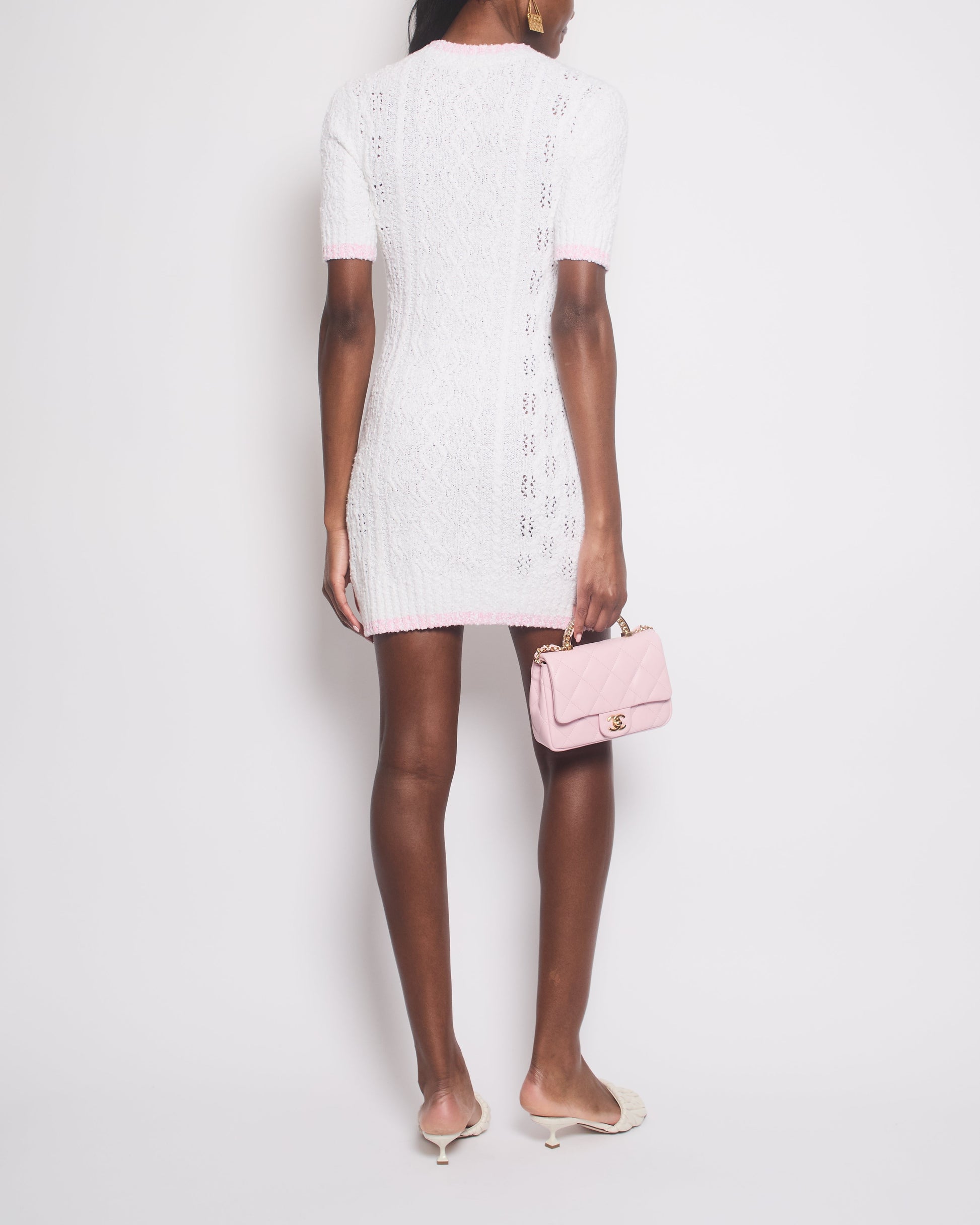 *HOT* Chanel 24P Cream Short Sleeve Knitted Mini Dress with CC Logo Buttons and Pink Hem Details Size FR 36 (UK 8)