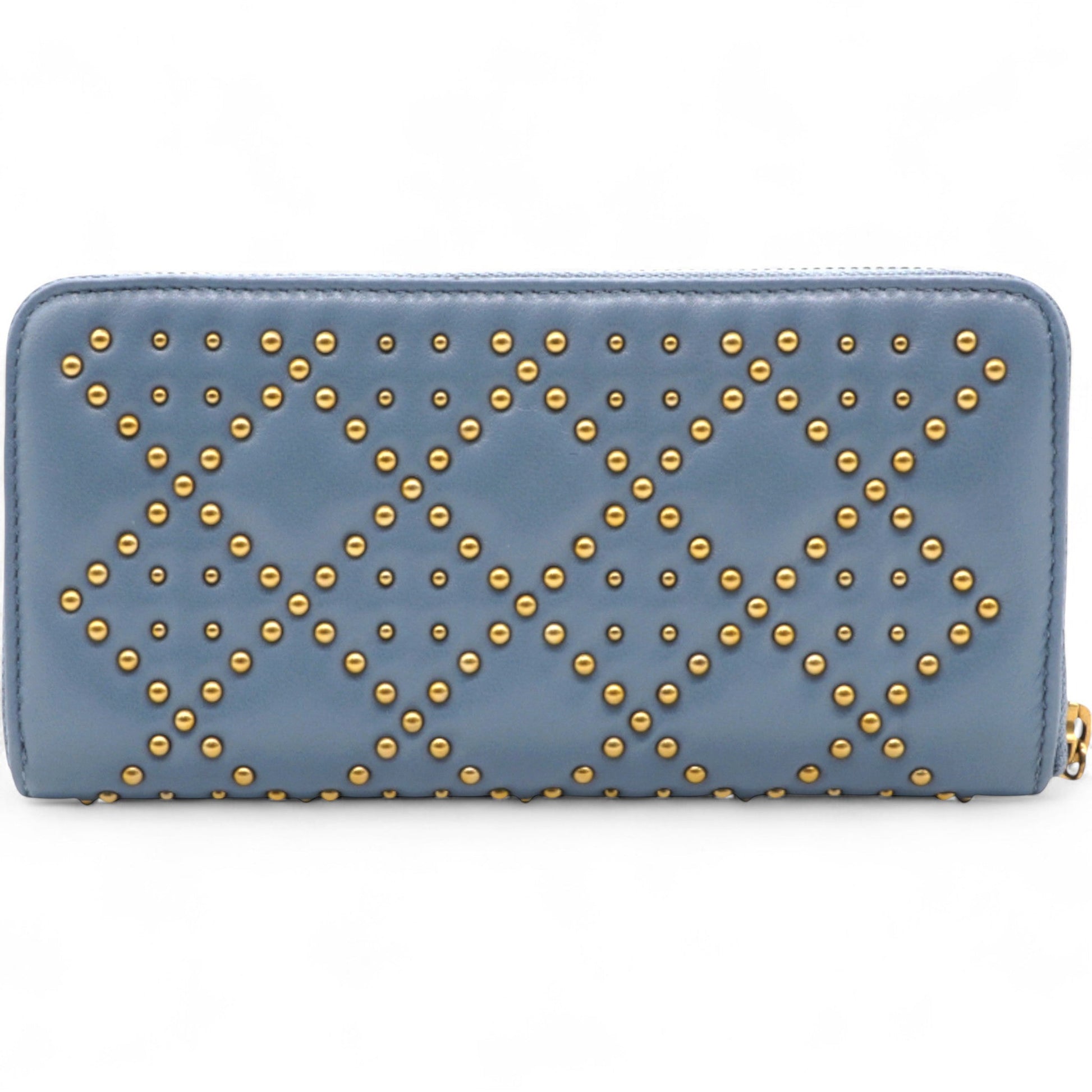 | Cloud blue lambskin leather exterior with cannage patterned antiqued gold tone studs;three sided zip opening to main compartment; tonal leather lined interior with three main compartments; 1 x zipped coin pocket; 3 x slip pockets and 8 x card slots. | Material: Leather Lining: Leather Hardware: Gold color finish metal Accessories: Serial Number: 33-MA-0157 Production Year: 2017 |