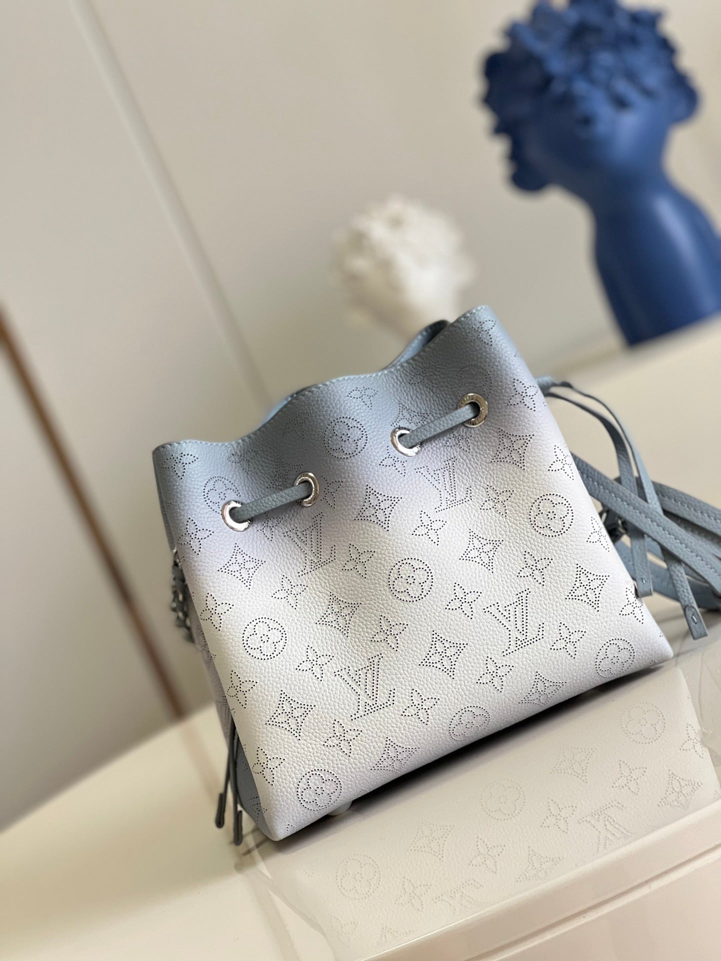 The Bella bag is reinterpreted with a delicate gradient color animation on the iconic Mahina perforated calf leather, with tone on tone calf leather trim. The gradient halo effect is achieved by spraying the dye by hand to gradually pigment the leather, making each bag unique. This small bucket bag is secured with a drawstring and includes a detachable, round coin purse.