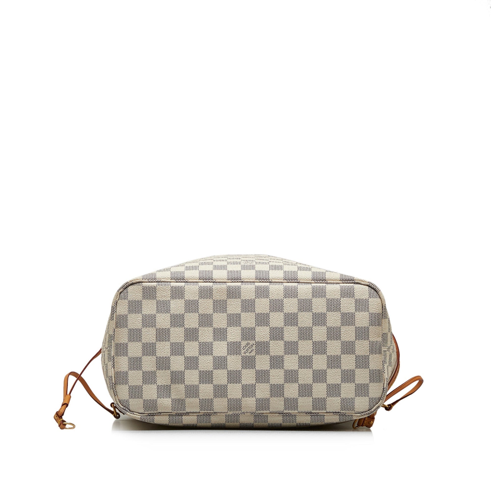 The Damier Azur Neverfull MM features a Damier Azur canvas body, flat leather handles, an open top with a lobster claw clasp, and an interior zip pocket.