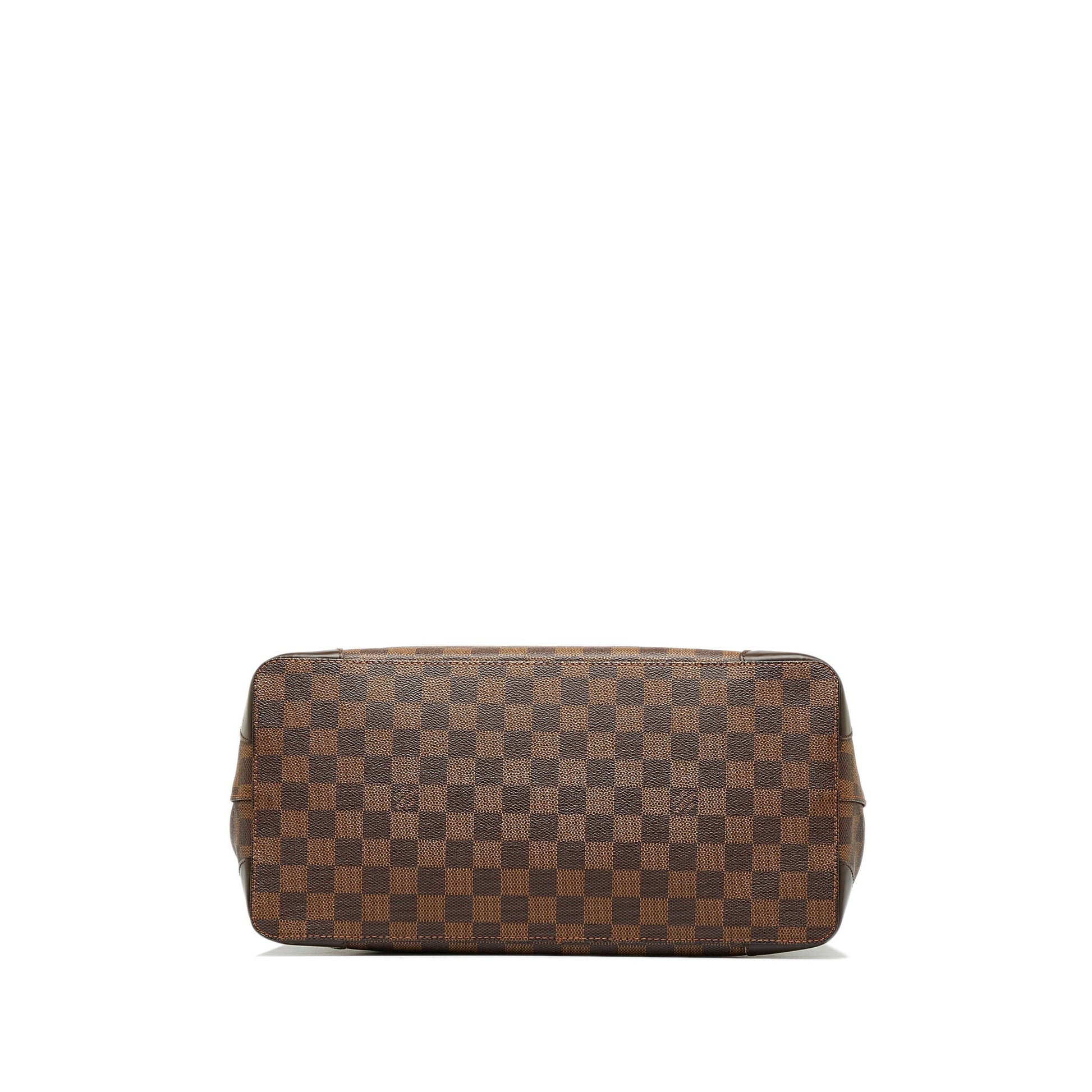 The Hampstead PM features a damier ebene canvas, flat leather handles, an open top, and interior zip and slip pockets.