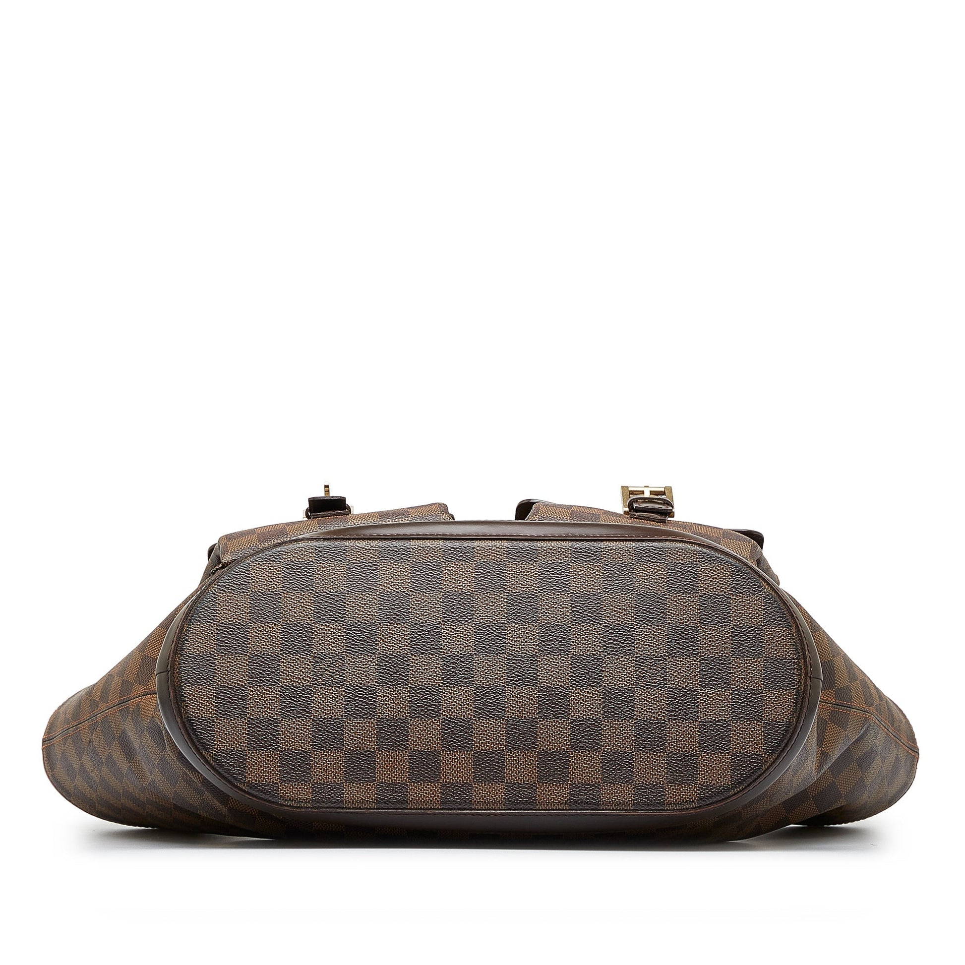 The Manosque GM features a damier canvas body, front exterior flap pockets, rolled leather handles, an open top with a hook closure, and interior zip pockets.