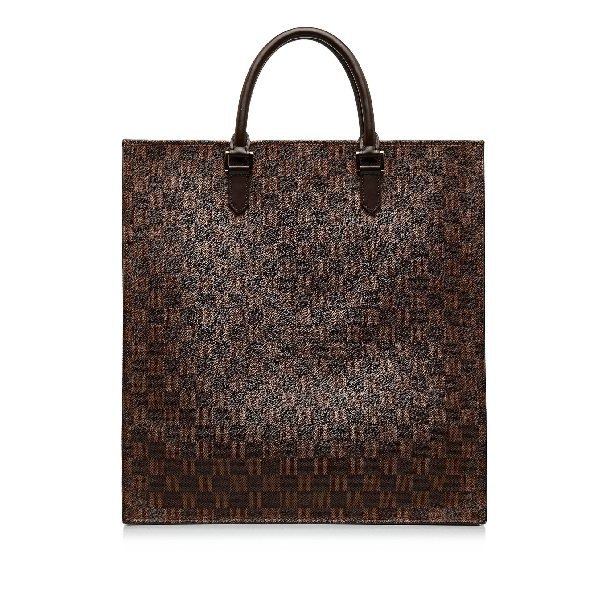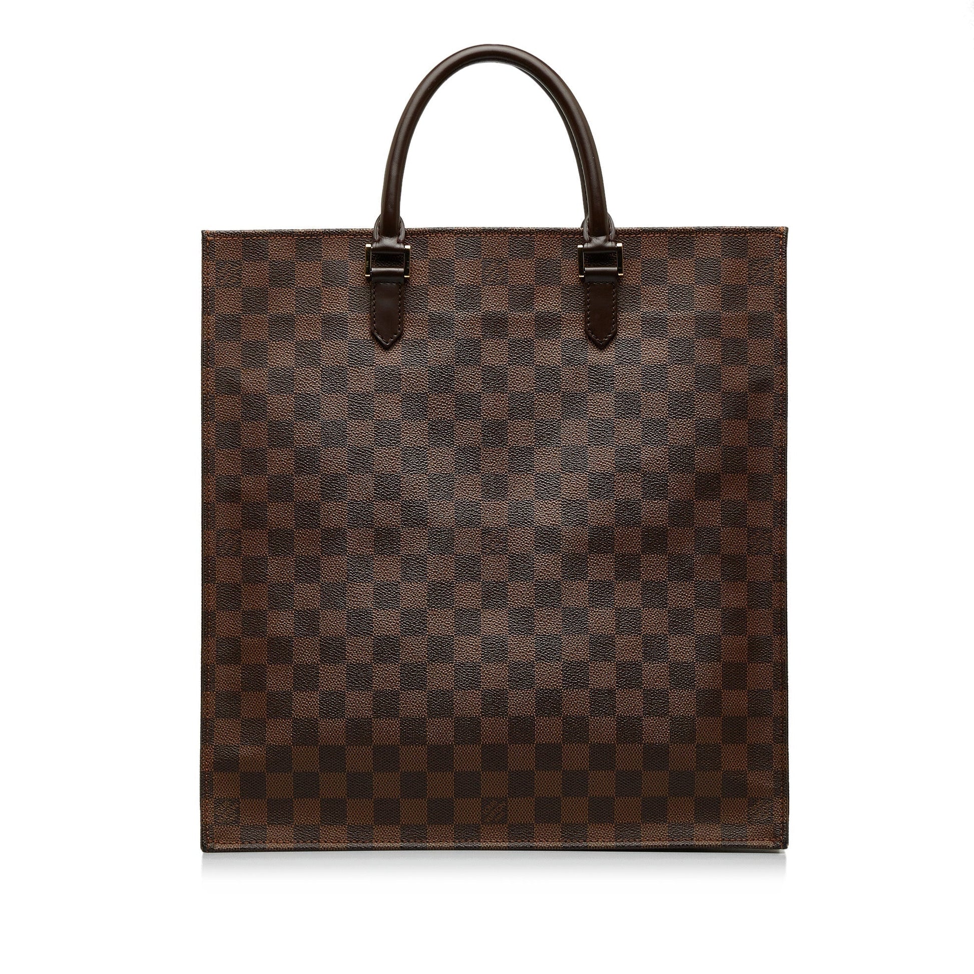 The Sac Plat features a damier canvas body, rolled leather handles, an open top, and interior slip pockets.