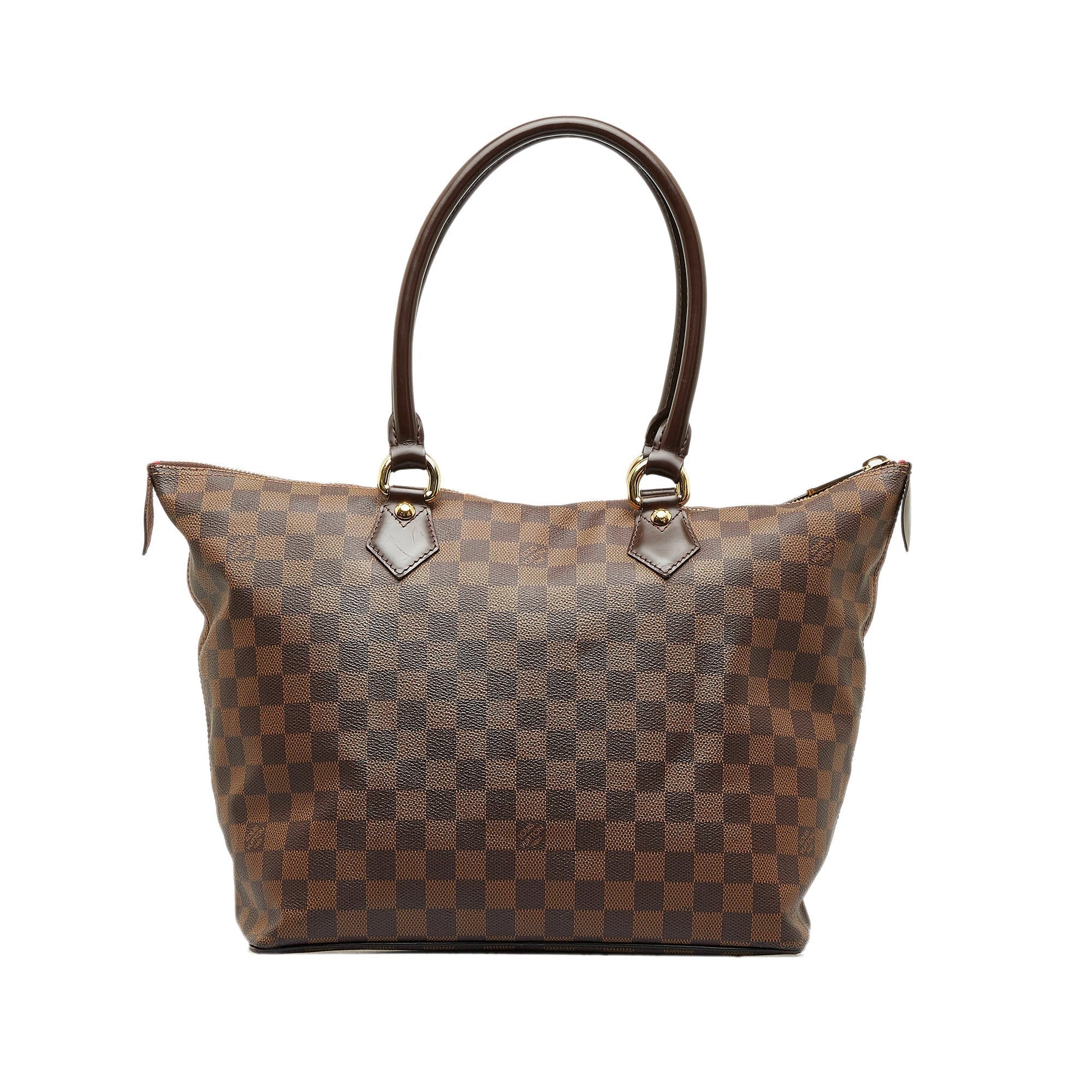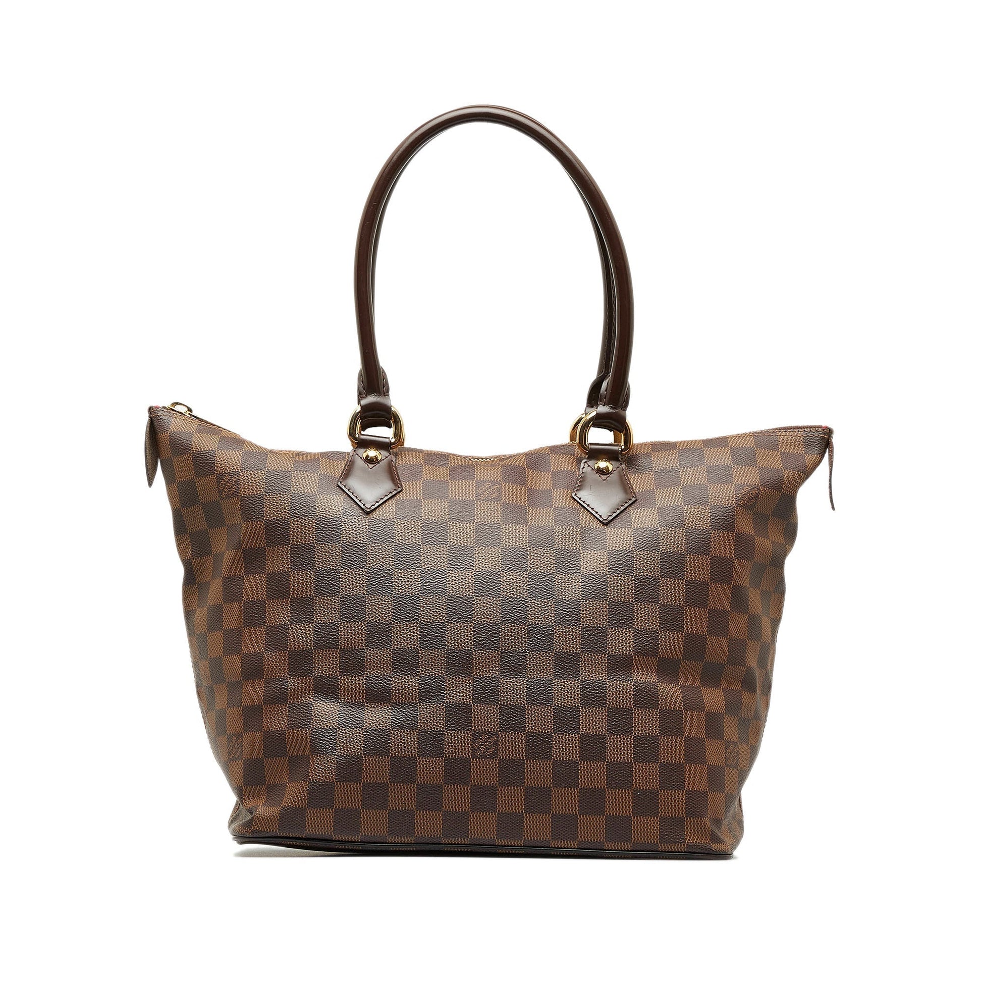 The Saleya MM features a damier ebene canvas body, rolled leather straps, top zip closure, and interior zip pocket.