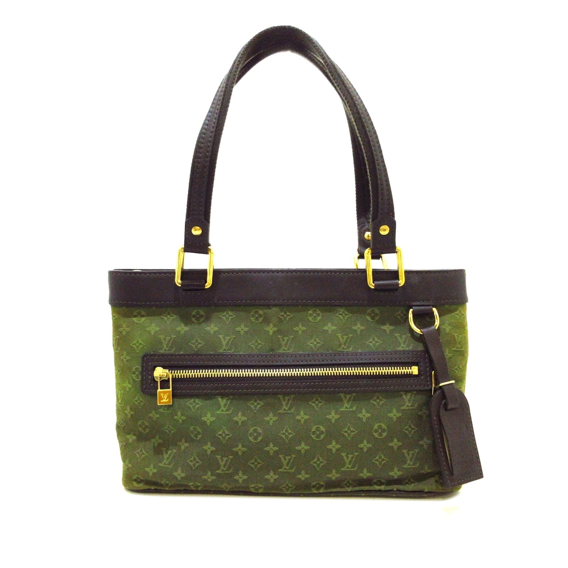 The Lucille PM features a monogram mini lin canvas body, flat leather straps, a top zip closure, an exterior front zip pocket, and interior slip pockets.