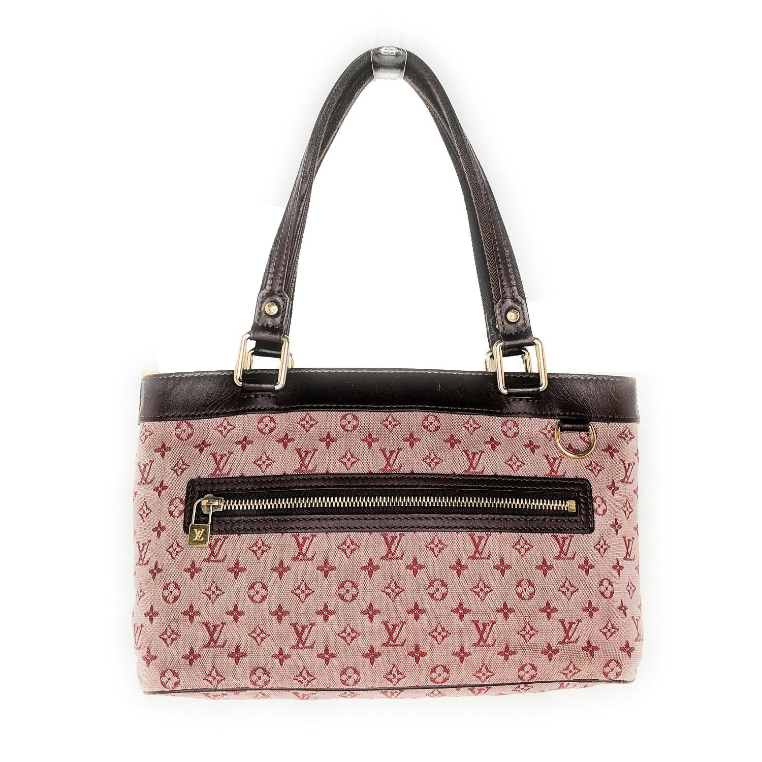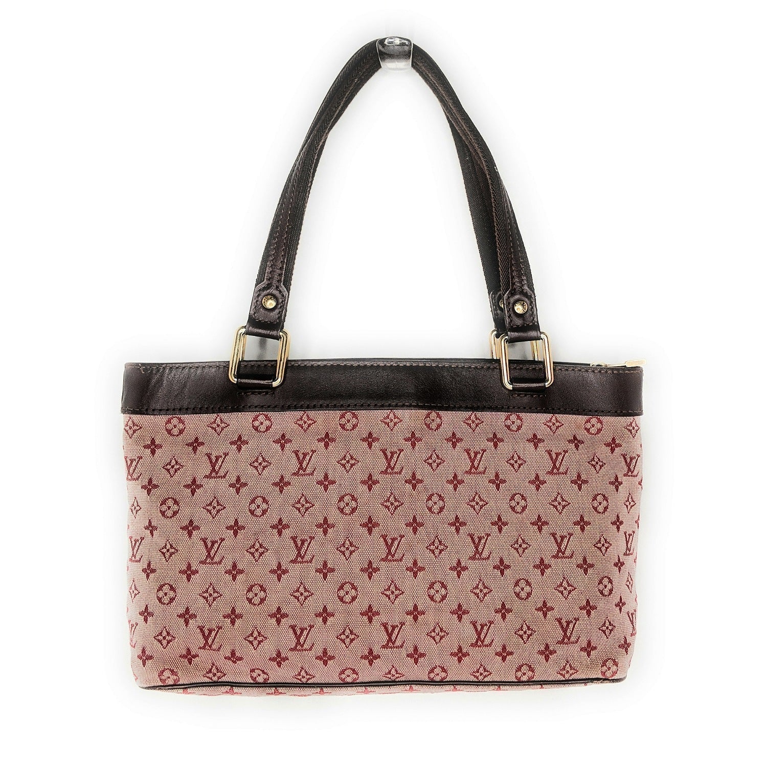 Cream and Oxblood Mini Lin monogram canvas Louis Vuitton Lucille PM with brass hardware, dual canvas shoulder straps, dark brown leather trim, single zip pocket at front, textile lining, dual slip pockets at interior wall and zip closure at top. Retail price $890.