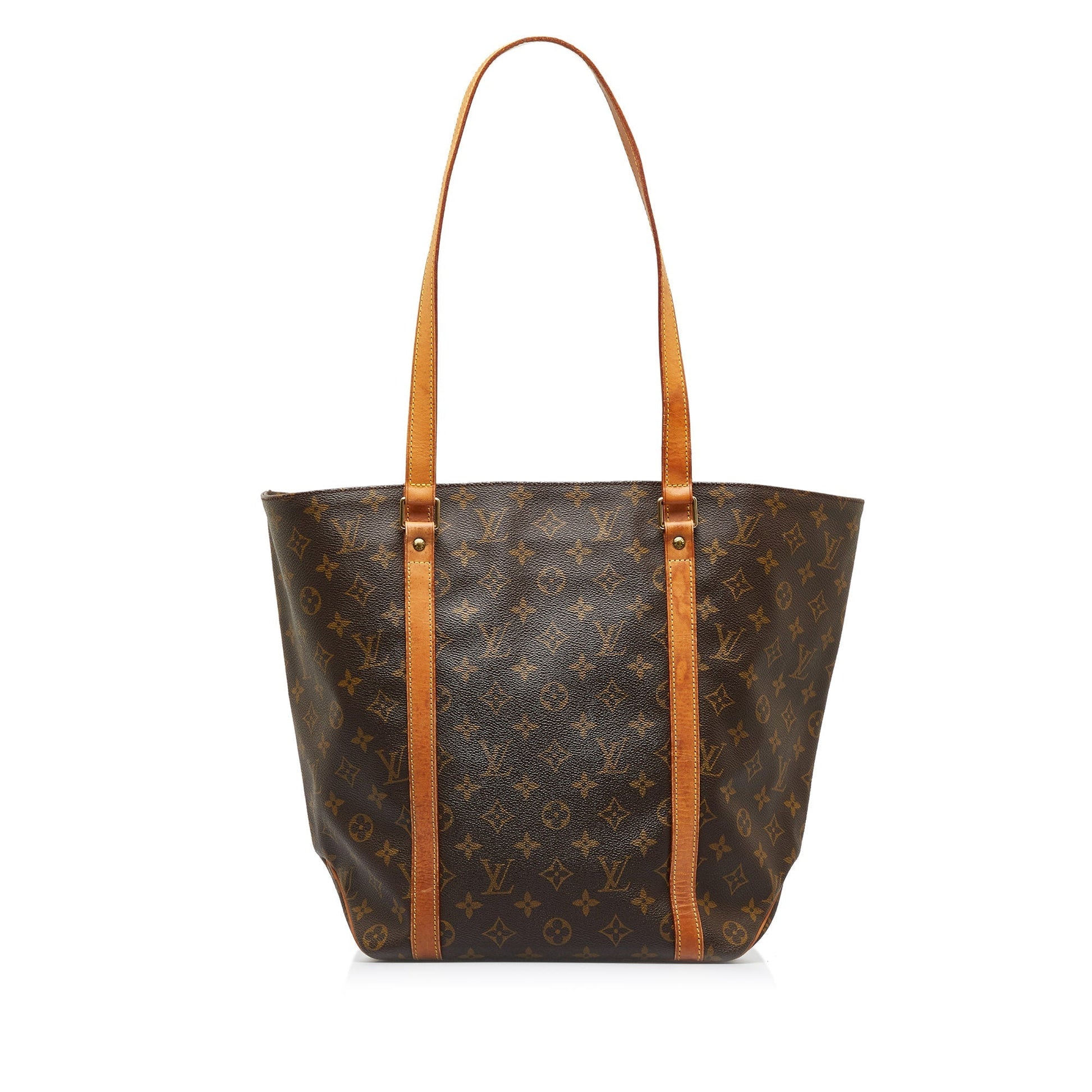 The Sac Shopping features a monogram canvas body with vachetta leather trim, flat vachetta leather straps, an open top, and an interior zip pocket.